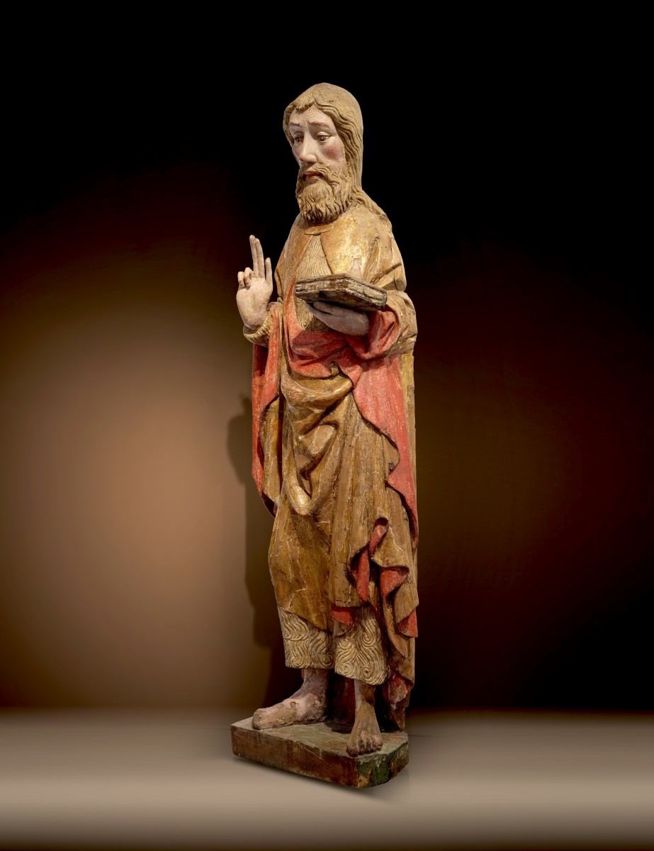 This monumental wooden sculpture of St. John the Baptist was created in Bohemia shortly after 1400. The sculptural elaboration, the vivid incarnation and the virtuoso treatment of hair and folds suggest an influence from the workshop of Master Theoderich – the famous artist who worked as a court painter under Charles IV and whose workshop is considered to have had a formative influence on the style of Prague art around 1380-1400.