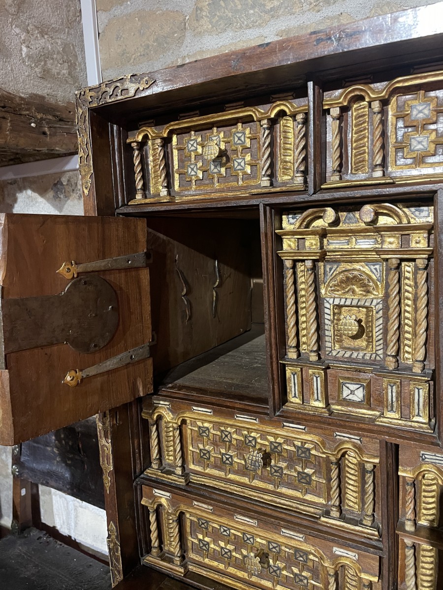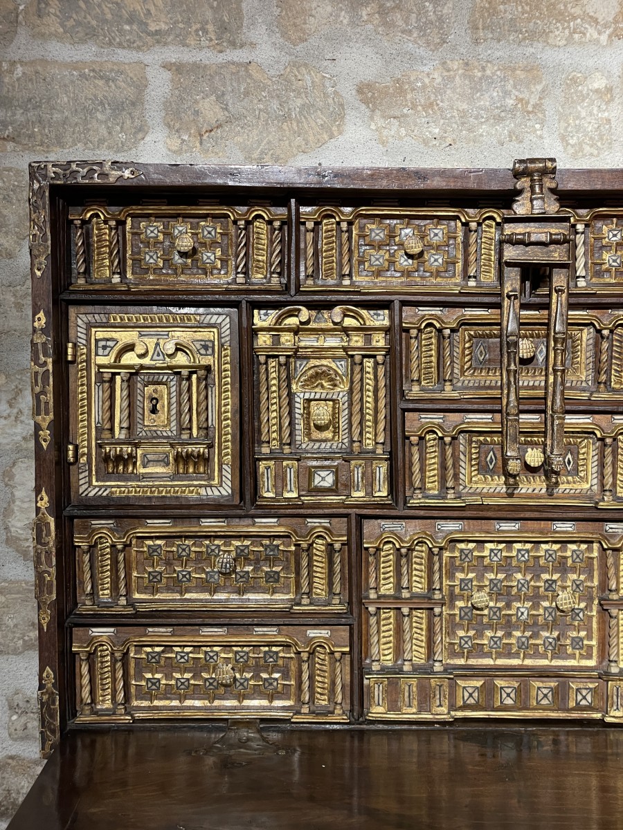 This cabinet, nowadays very rare, is a piece of furniture typically Spanish and has never been developped in any other country. Item of great value the bargueno was both a luxury piece exposed in state rooms and a functional travel chest as expressed by the handles and impressive lock.