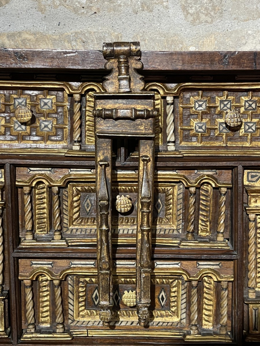 The drawers present a geometric bone inlaid decor while the door-leaves uses the architectural vocabulary with pointed arch scrolls and four bone twisted columns framing the padlock.