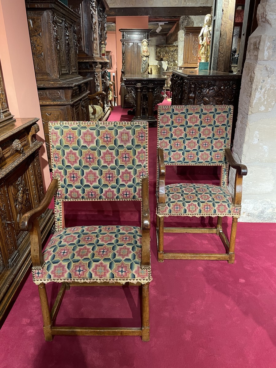 These seats, with their great simplicity, inspire a sense of ceremonial seating through the quality of their proportions. Pure Henri II period walnut seats, they reflect the taste of an era where grace and balance combine with majesty.