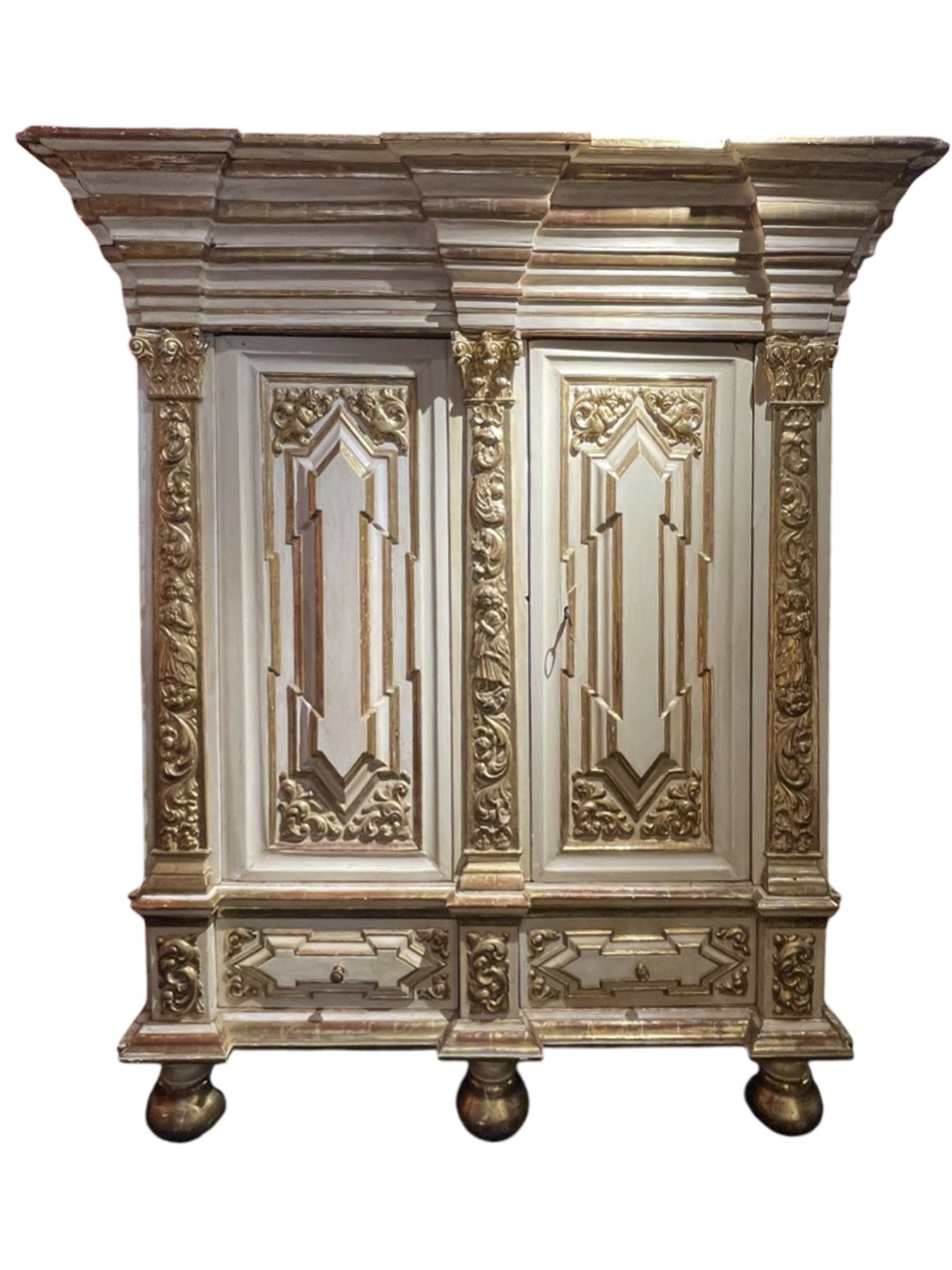 This imposing wardrobe is punctuated by three corinthian pilasters, carved with foliage and flowers framing a central female figure and rests on three ball feet.