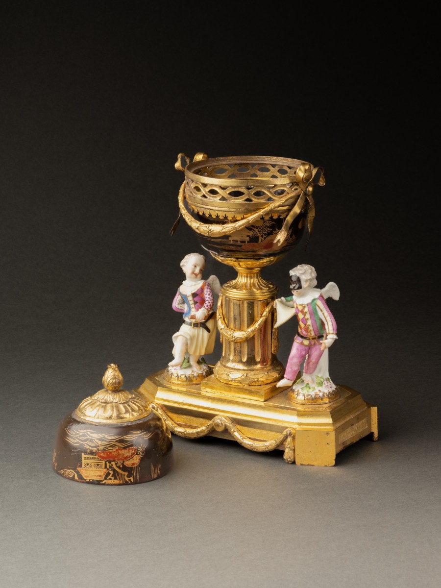 The piece consists of two inverted Japanese lacquer teacups, separated by an openwork bronze frieze that serves as the potpourri tray.