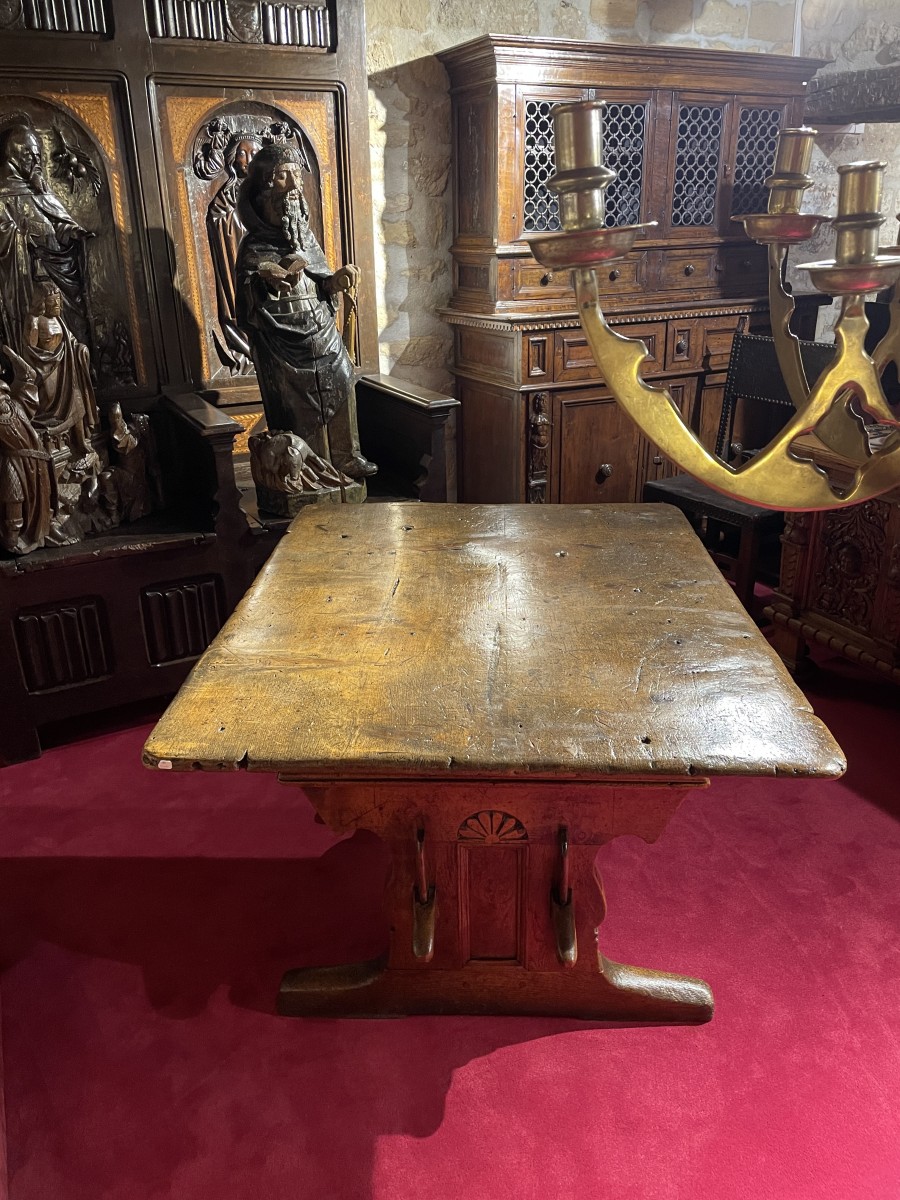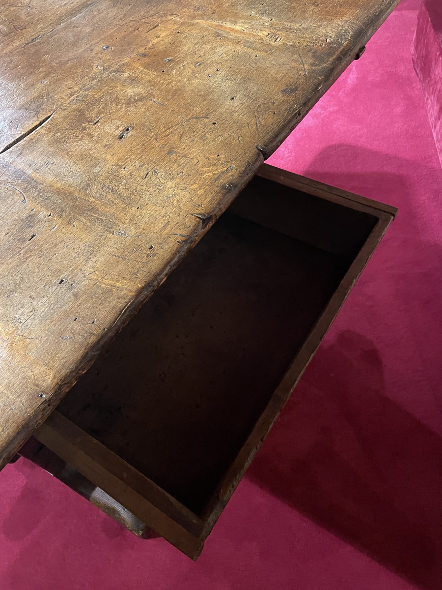 A narrow drawer along the full length of the left side was intended to store coins and bills of exchange, enhancing the table’s functionality as a professional workstation.