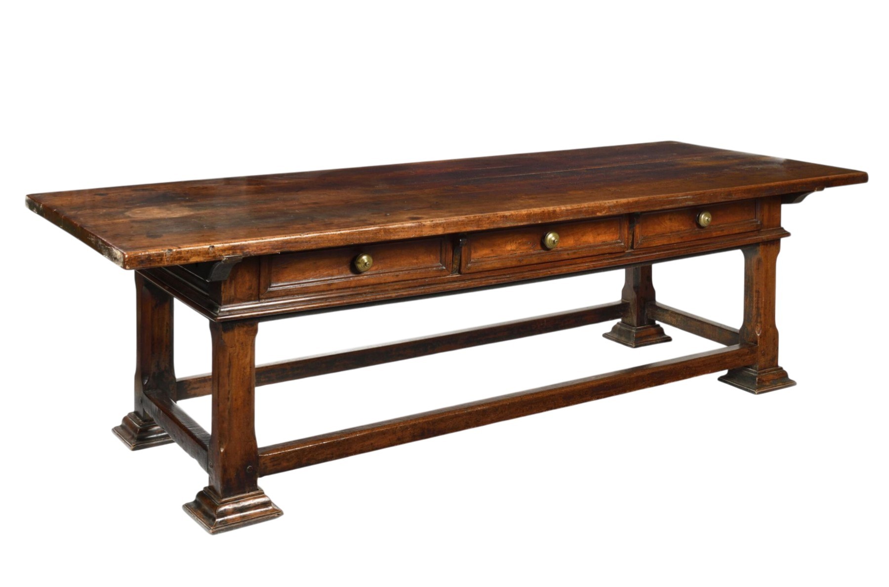The generously thick tabletop overhangs the apron, which is fitted with three drawers. Moulded and each centred with a brass pull, the drawers are separated by carved consoles.