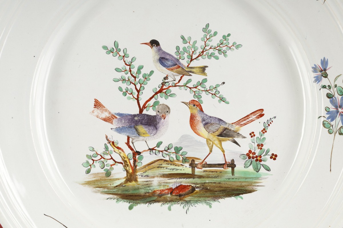 Small circular faience dish from Saint?Clément, decorated in petit feu with birds on a flowered mound and floral motifs on the rim.