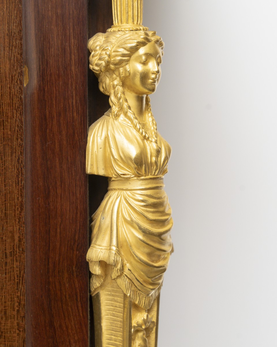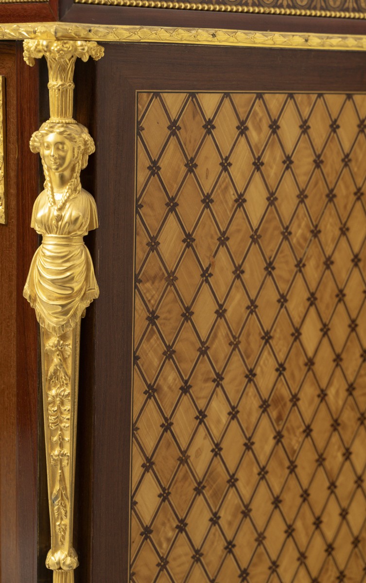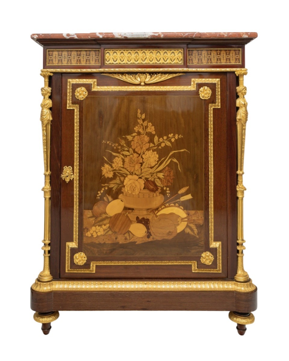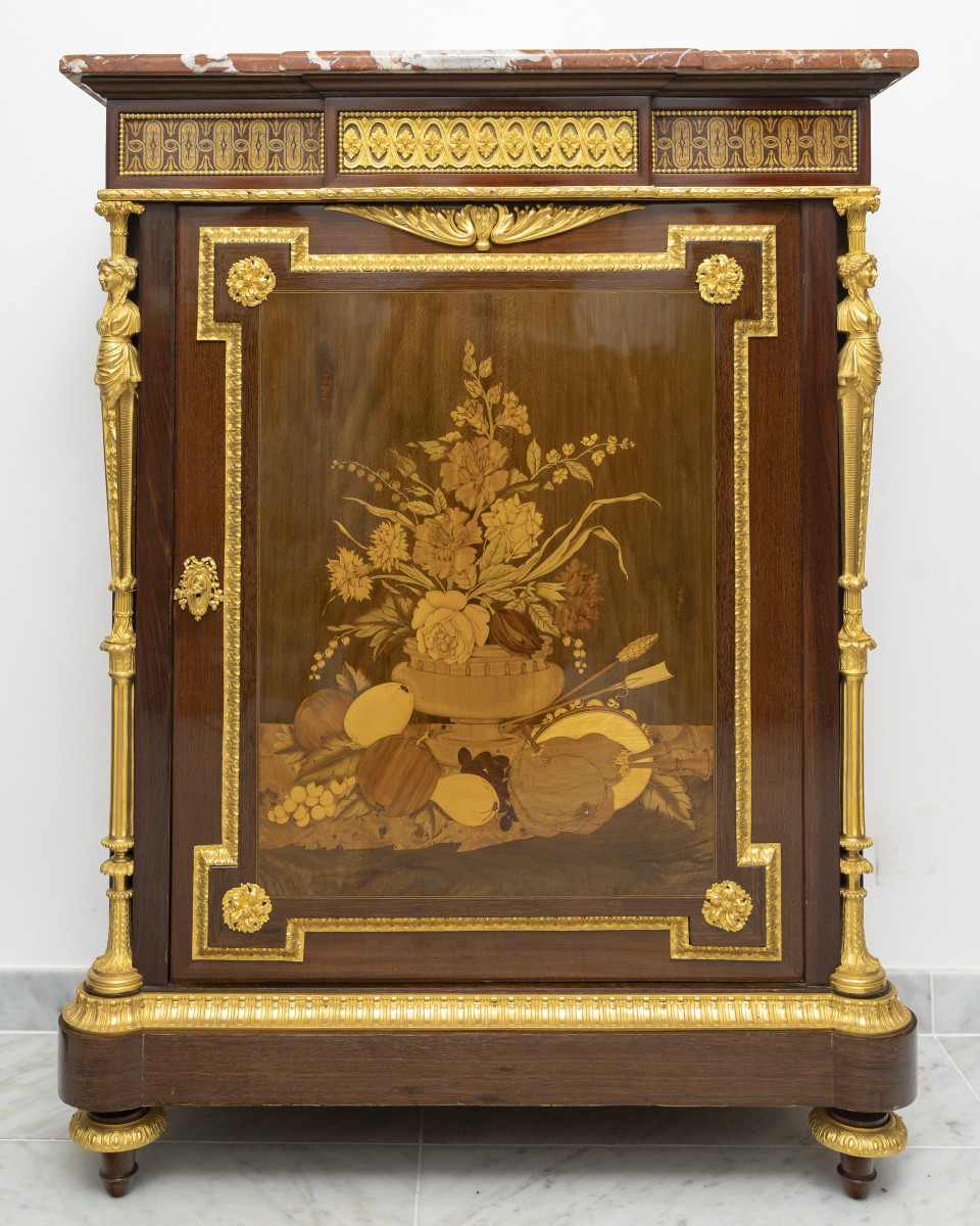 The façade consists of a central door decorated with a vase containing a bouquet of flowers, above a composition of fruits, executed in several precious wood veneers. The finely chased and mercury-gilded bronzes, notably the two caryatids framing the door, add majesty and elegance to the piece.
