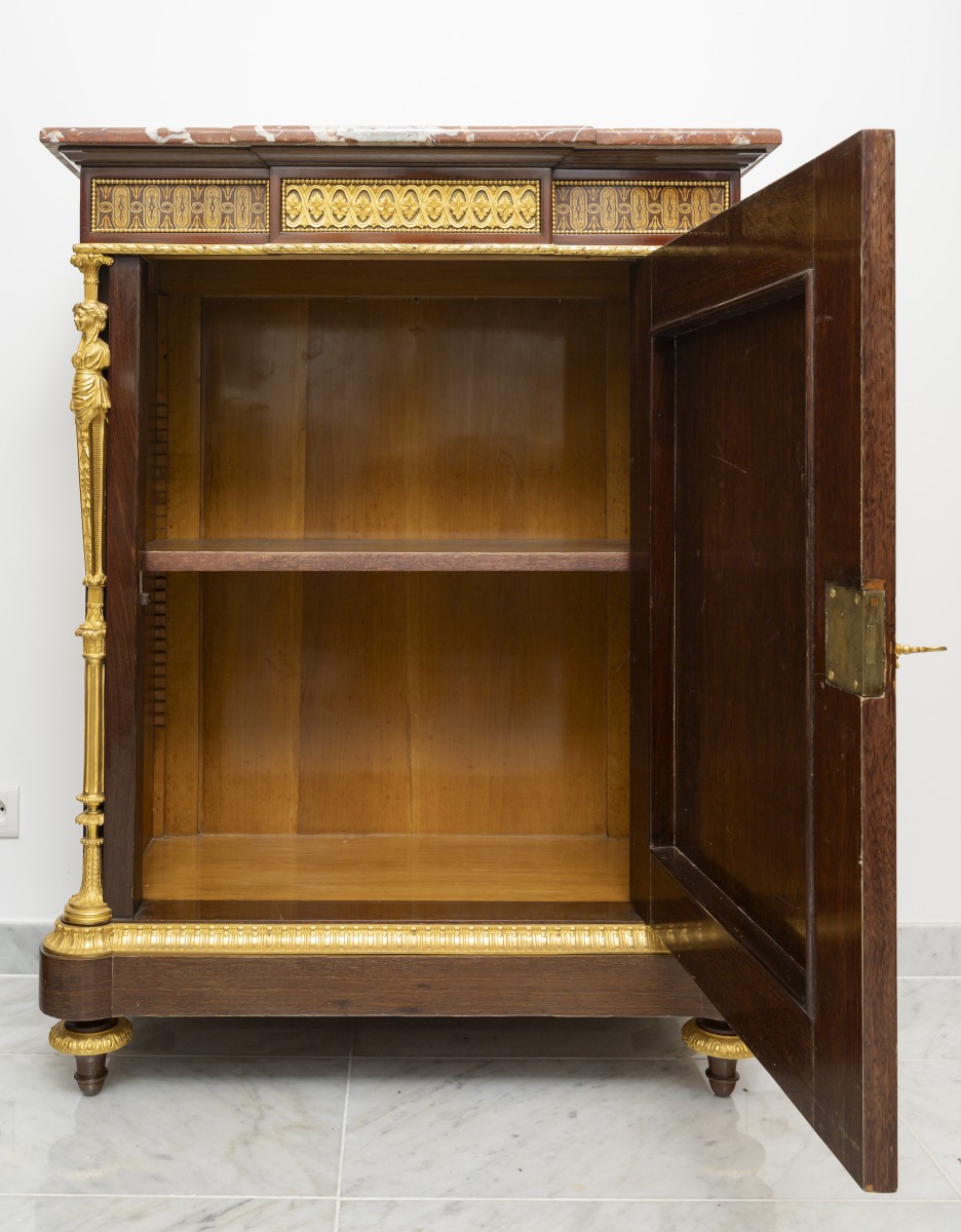 Louis XVI-style cabinet crafted in precious woods, notably amaranth, citronwood, pearwood, and rosewood, adorned with finely chased and mercury-gilded bronzes, flanked by two magnificent caryatids, and topped with a red royal marble top.