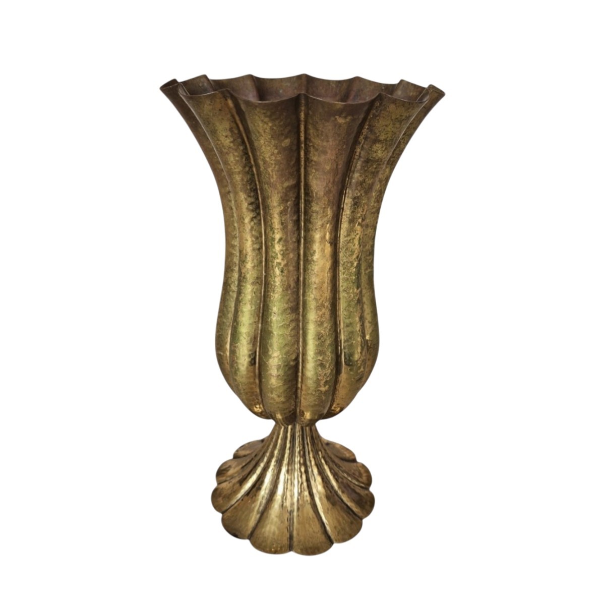 This vase belongs to the metalwork produced by HOFFMANN between 1917 and 1924, a period marked by a search for clean, perfectly proportioned forms. Resting on a flared pedestal base, the fluted body is enlivened by regular hammering that subtly captures the light. The slightly undulating upper rim softens the overall geometric rigor.