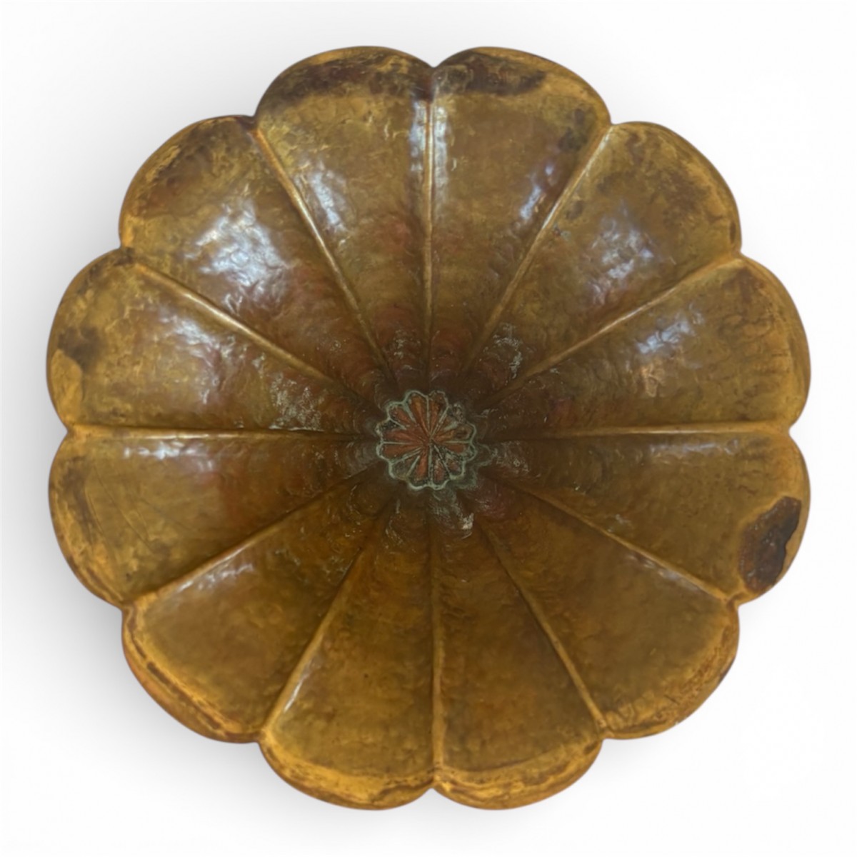 Repoussé and hammered brass, formerly gilded.