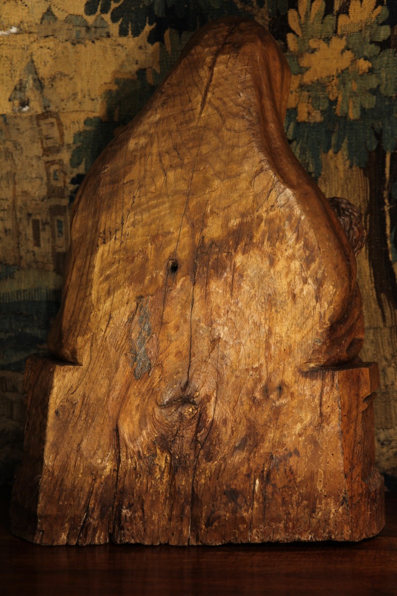 Pietà in carved oak wood. The Virgin seated, covered with a veil cloak and wearing the wimple, holds on her knees the body of her son.