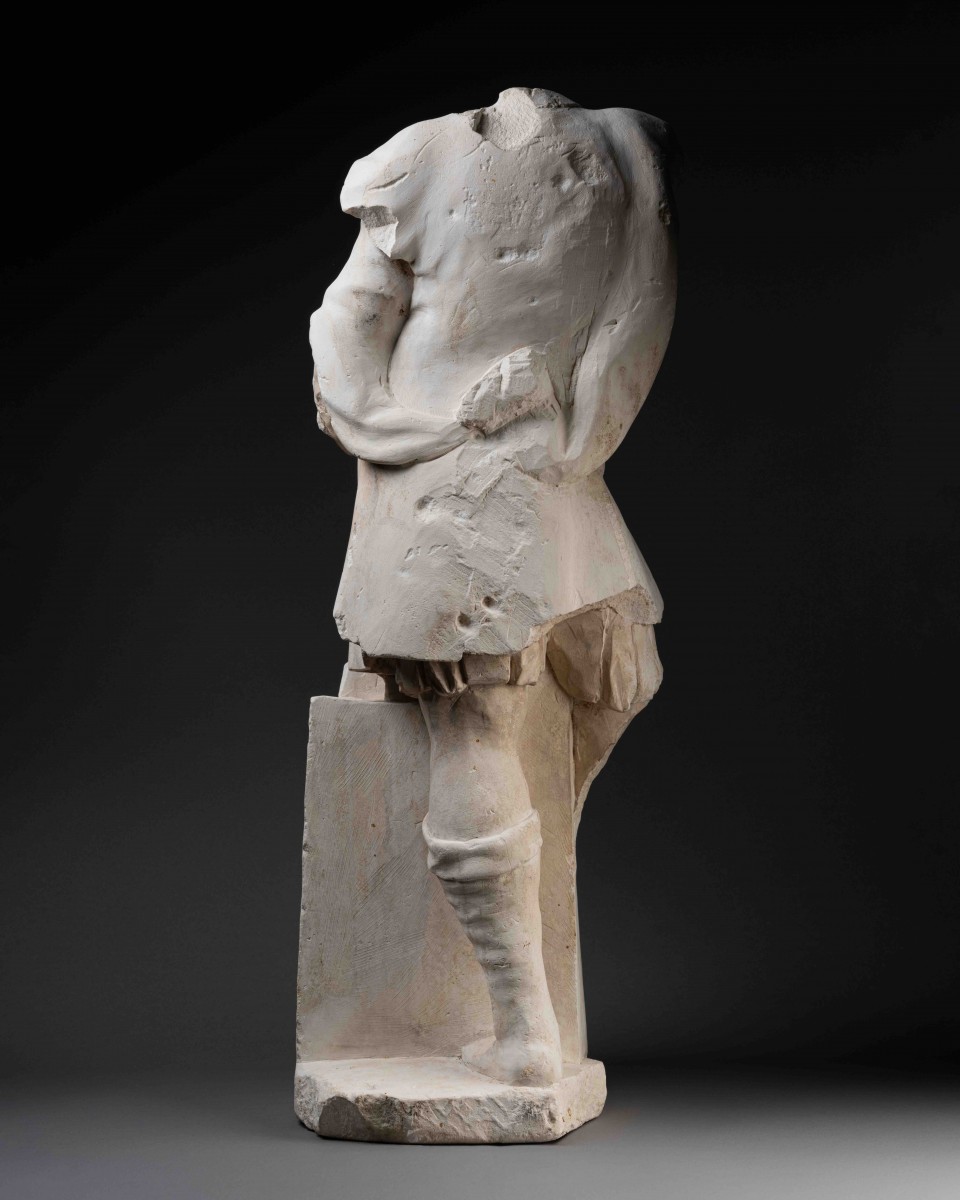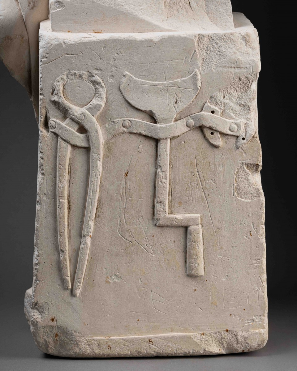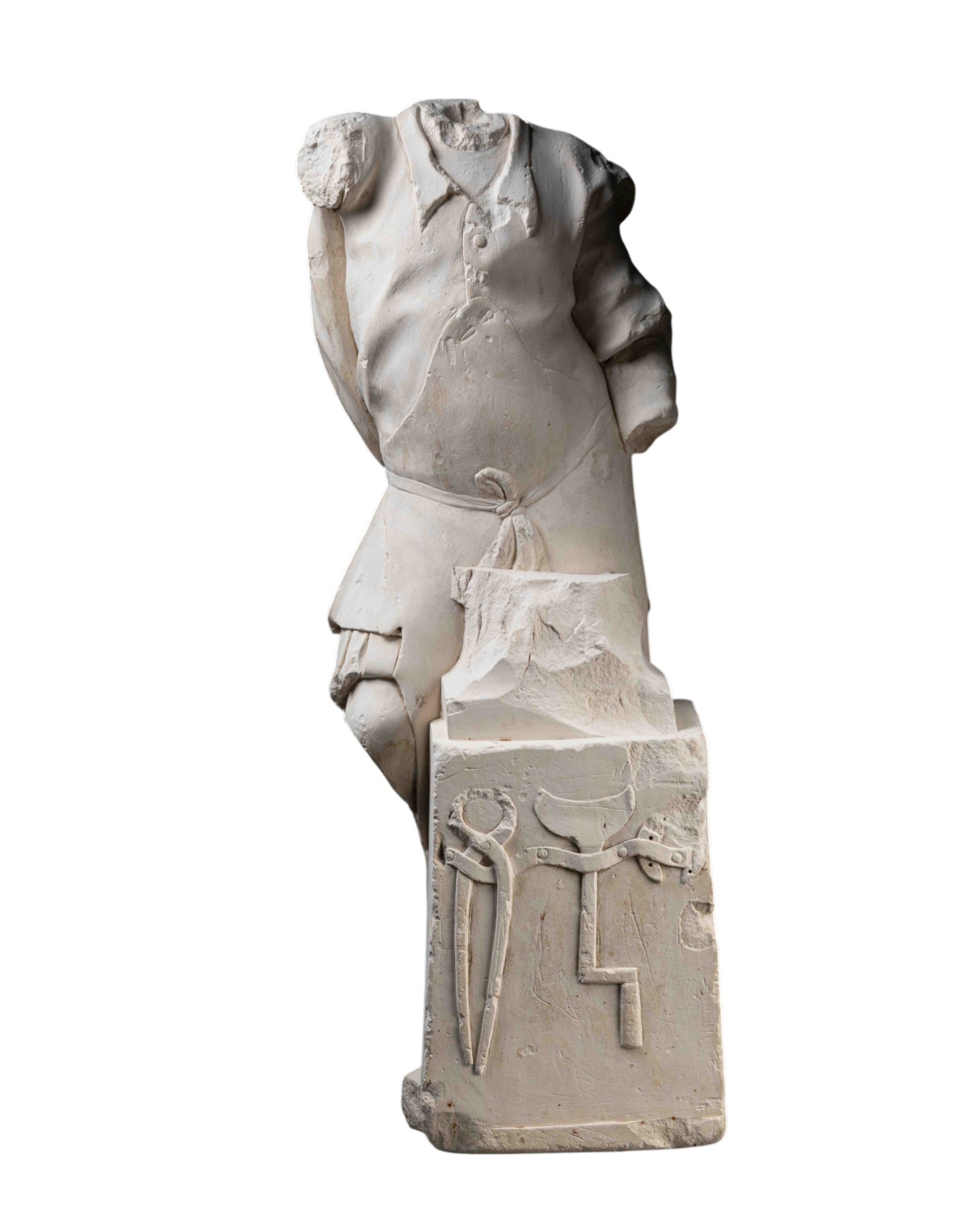 This fragmentary limestone figure represents Saint Eloi (Eligius), the patron saint of numerous metalworking guilds, including goldsmiths and blacksmiths. The saint is depicted standing before his workbench, the front of which is carved in relief with the tools of his trade — a pair of tongs, a crescent-shaped implement, and a bent metal rod—traditional attributes alluding to his profession as a master metalsmith and his later veneration by related crafts. The body leans slightly forward and to one side, creating a gentle twist through the torso that conveys both movement and the physical engagement of a working smith. This rhythmic shift of weight is particularly striking: the right shoulder dips as if mid-gesture, while the drapery pulls diagonally across the chest, reinforcing the sense of action momentarily suspended. The saint’s garments are rendered with remarkable care. He wears a fitted doublet with a crisply articulated collar, seams, and buttoning, its soft folds suggesting a thick, workman’s fabric shaped by daily labor. A tied apron, knotted at the waist, cascades in controlled, angular folds that emphasize the sculptor’s sensitivity to texture and structure. The figure would likely decorated a guild chapel — intended to invoke the saint’s protection over artisans and their work. The refined modeling of the torso, the beautifully observed clothing details, and the implied motion of the figure all convey the dignity of a craftsman-saint portrayed with naturalism and subtle elegance.