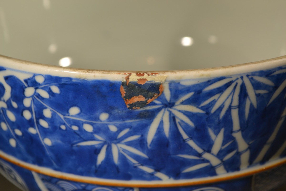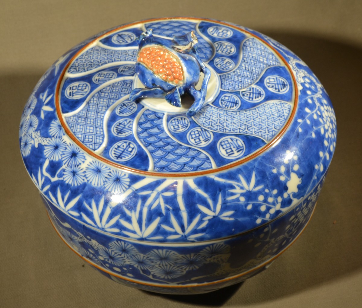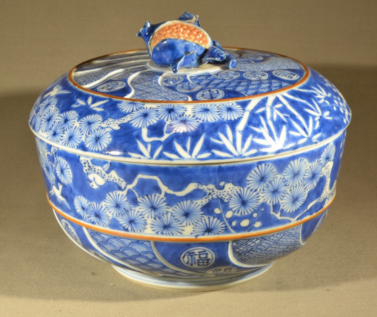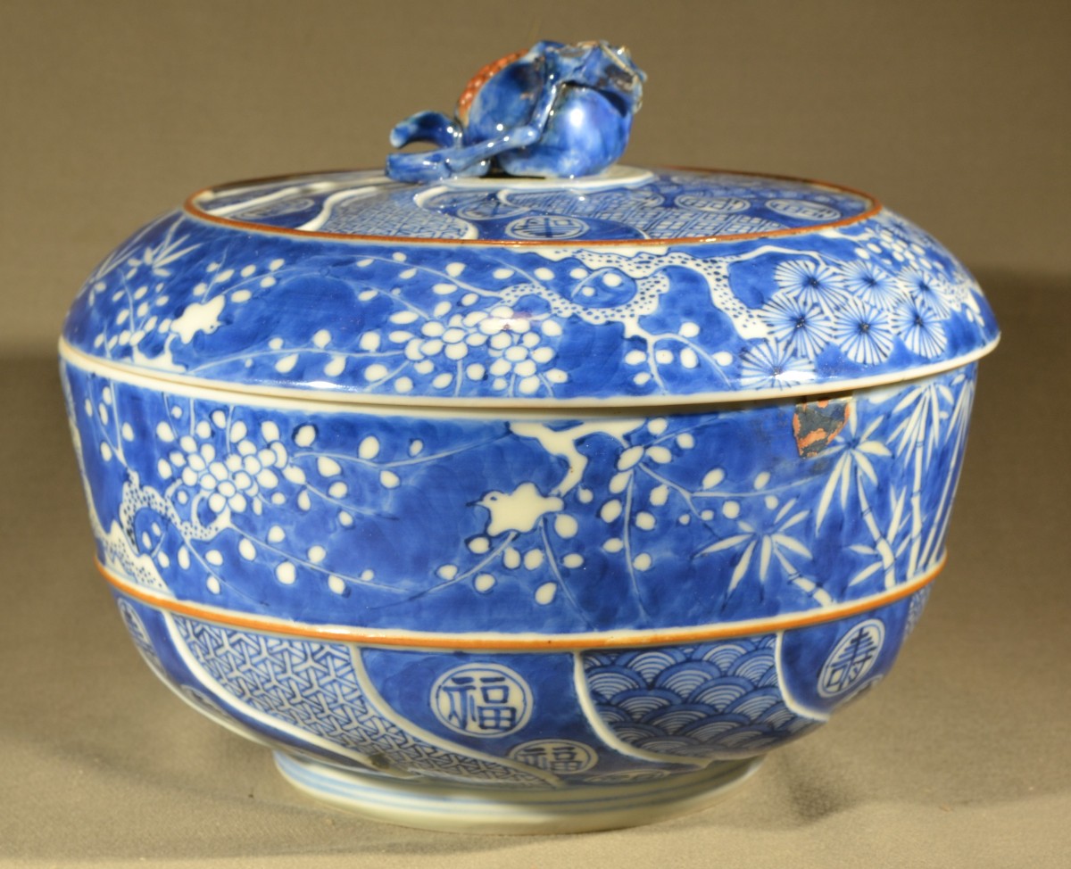 Large covered Chinese porcelain bowl decorated with the Three Friends, pine, bamboo, and plum blossoms, painted in an exceptionally luminous cobalt blue. A pomegranate branch with fruit serves as a handle. This type of porcelain with Japonisme decoration was created in China during the 17th century for the Japanese market. Several imperfections are visible in the photos: a chip on the rim of the bowl (previously restored), wide but very thin; the inner rim of the lid is partially missing; and one leaf on the pomegranate branch is broken. This type of porcelain made for Japan during this period is called Shonzui. The example offered here is among the finest creations of its kind, thanks to its emblematic Three Friends design, the precision of the drawings, and the superb quality of the cobalt blue. Transition period or early Kangxi reign, second half of the 17th century. China. 185mm x 140mm.