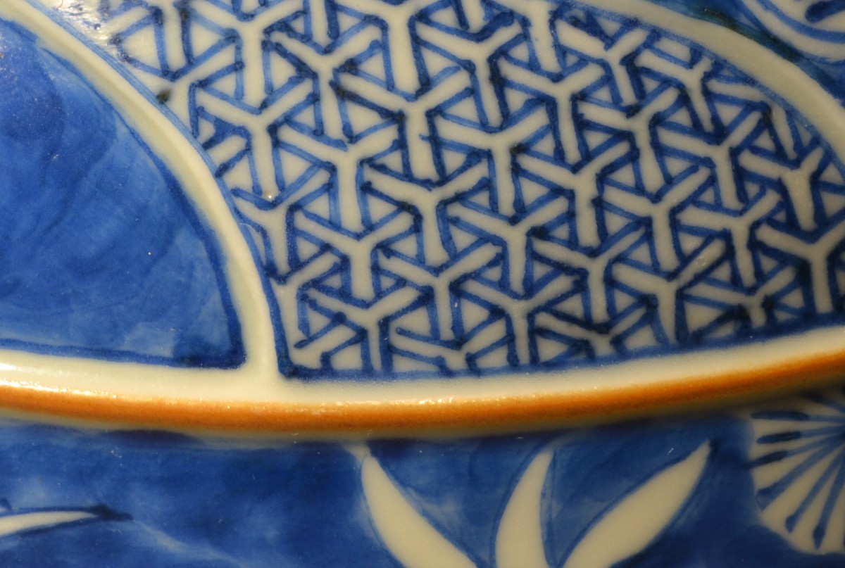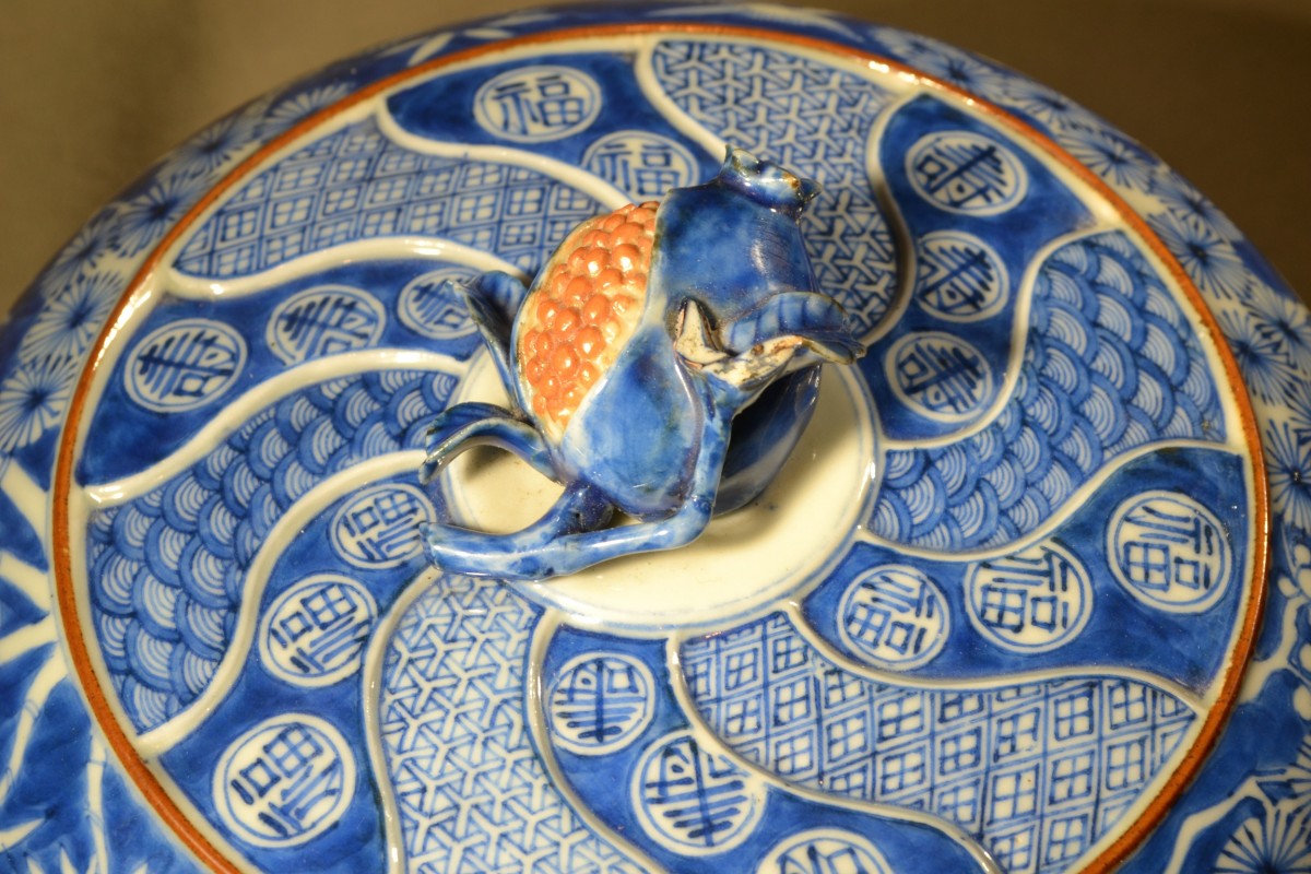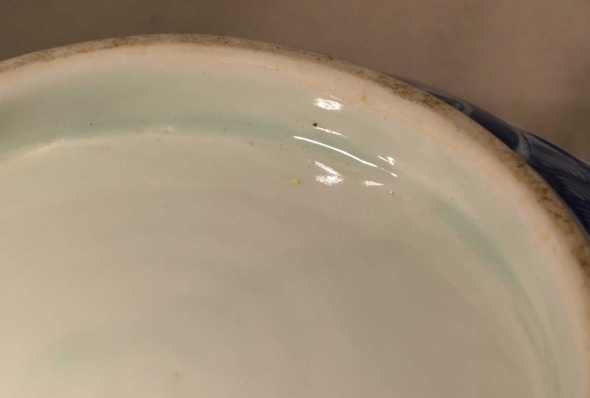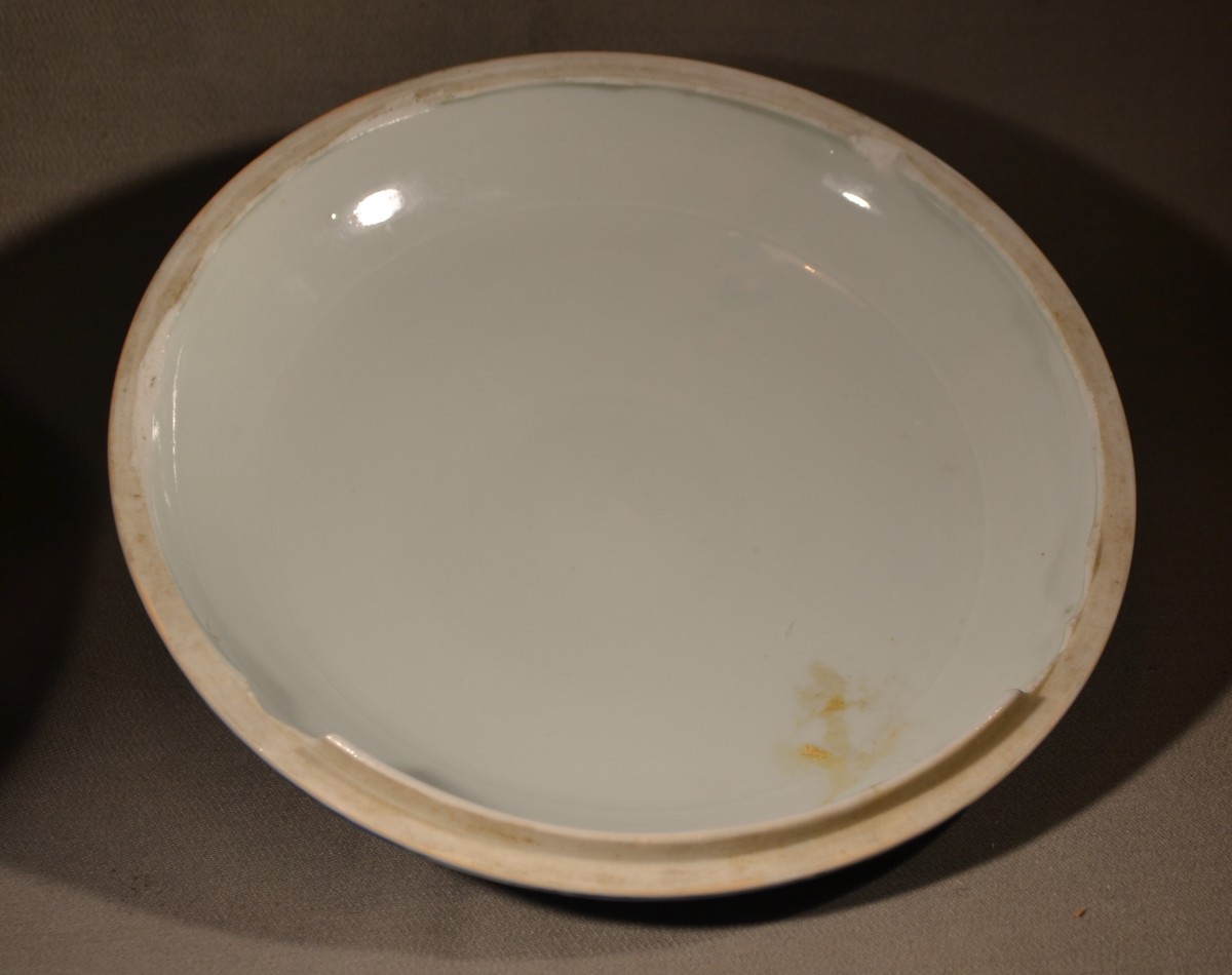 Large covered Chinese porcelain bowl decorated with the Three Friends, pine, bamboo, and plum blossoms, painted in an exceptionally luminous cobalt blue. A pomegranate branch with fruit serves as a handle. This type of porcelain with Japonisme decoration was created in China during the 17th century for the Japanese market. Several imperfections are visible in the photos: a chip on the rim of the bowl (previously restored), wide but very thin; the inner rim of the lid is partially missing; and one leaf on the pomegranate branch is broken. This type of porcelain made for Japan during this period is called Shonzui. The example offered here is among the finest creations of its kind, thanks to its emblematic Three Friends design, the precision of the drawings, and the superb quality of the cobalt blue. Transition period or early Kangxi reign, second half of the 17th century. China. 185mm x 140mm.
