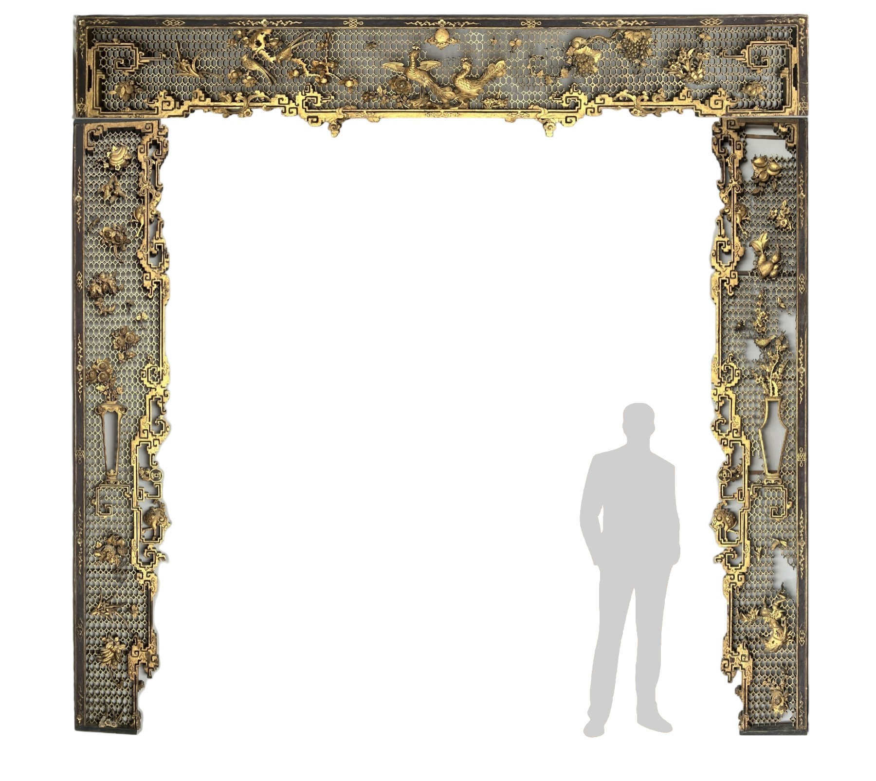 The exceptional quality of the carvings, the remarkable dimensions, the presence of the Manchu characters, and the use of camphor wood suggest that this piece was made for one of the rooms of the imperial palace. The presence of Fenghuang (phoenix) would point to one of the rooms reserved for the empress. Camphor wood is resistant to insects and mold, which is why it was used for sculptures in the imperial palace and for major temples. Note the dimensions: Height: 373 cm, Width: 362 cm. There are a few missing honeycomb panels, but all the raised motifs are complete. The two side panels have been slightly shortened by a few centimeters. This is an absolutely exceptional door frame, worthy of the finest museums. A photo montage with silhouettes helps to visualize the dimensions.