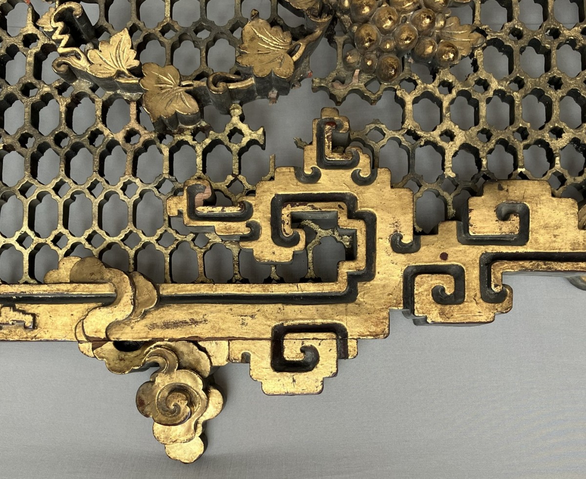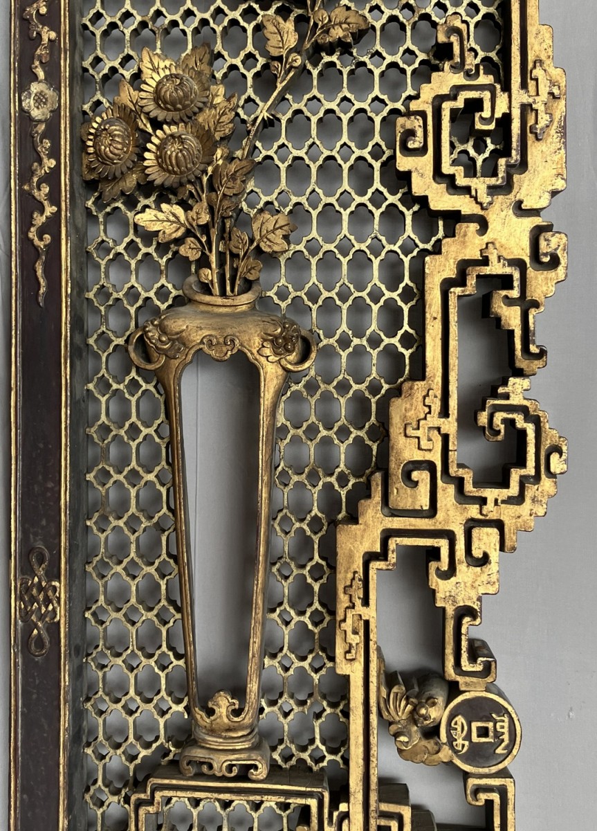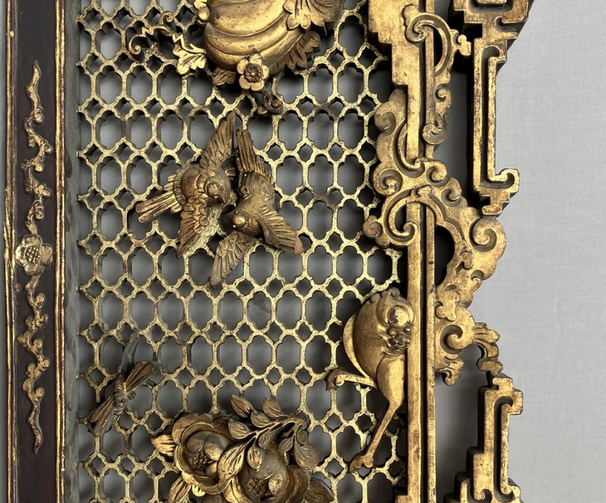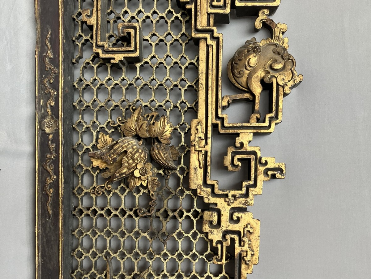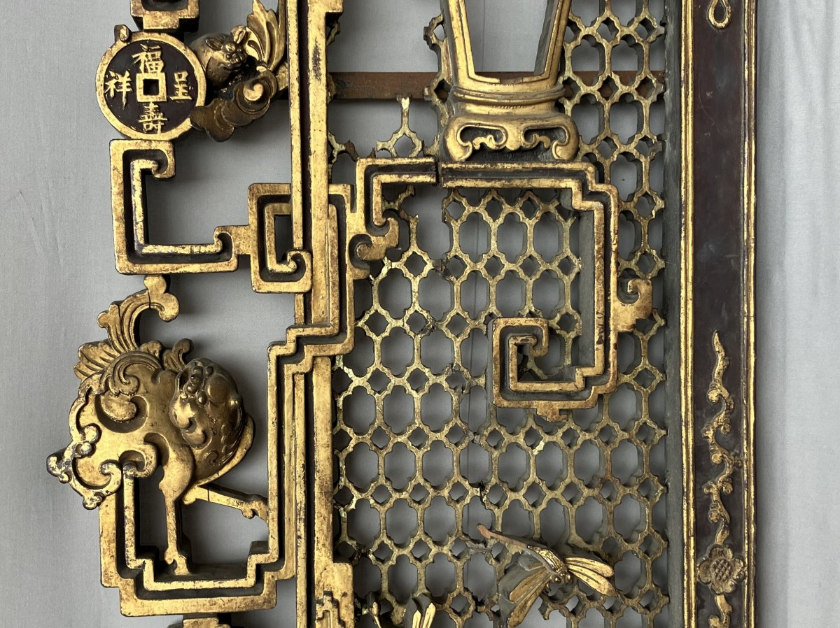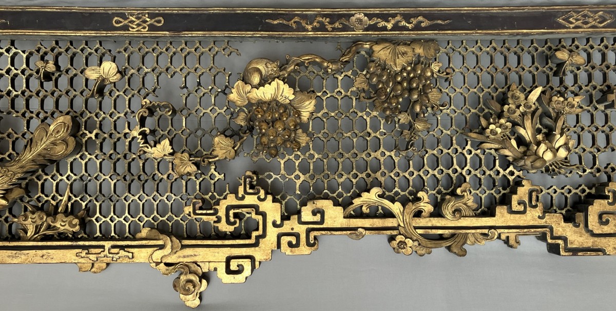 This colossal door frame is composed of three panels carved and sculpted from camphor wood, gilded with two shades of gold. On a honeycomb-patterned background, plants, fruits, and animals are carved in high relief. At the center of the pediment, a pair of phoenixes, symbols of the Empress, are visible. Two large vase shapes are carved into the side panels; it is likely that these two spaces were intended to hold vase silhouettes, either in transparent woven silk, painted glass, or porcelain. Importantly, halfway up each panel are pierced coins supported by bats. The coin on the left panel bears Manchu characters, and the one on the right panel bears Chinese characters. The presence of both Chinese and Manchu characters on the same object is found in 18th-century imperial artifacts. The four Chinese characters appear to mean "good omen, longevity, happiness under the star (sky)." The two Manchu characters, which can be translated as "Boo Kiyan," are found on imperial coins from the Qianlong period. These two marks, which the sculptor reproduced on the door frame, therefore represent a talisman, reversible on both sides, with a formula known in the 18th century.