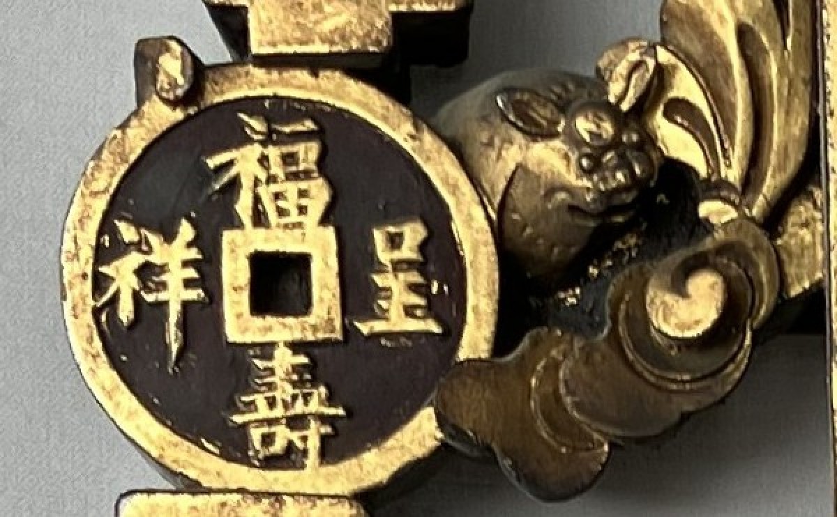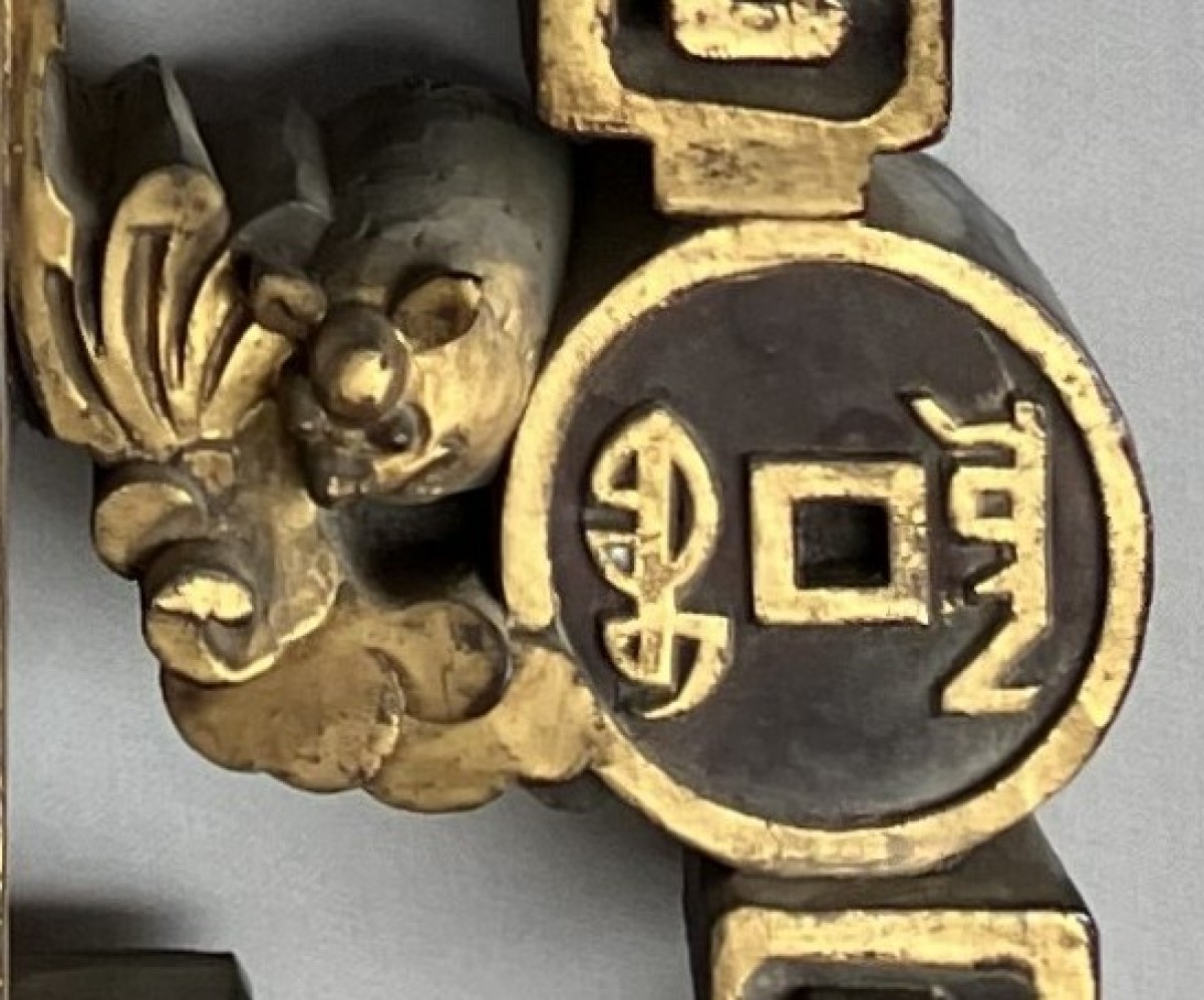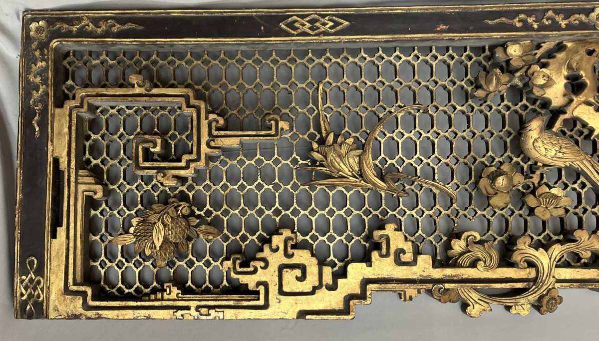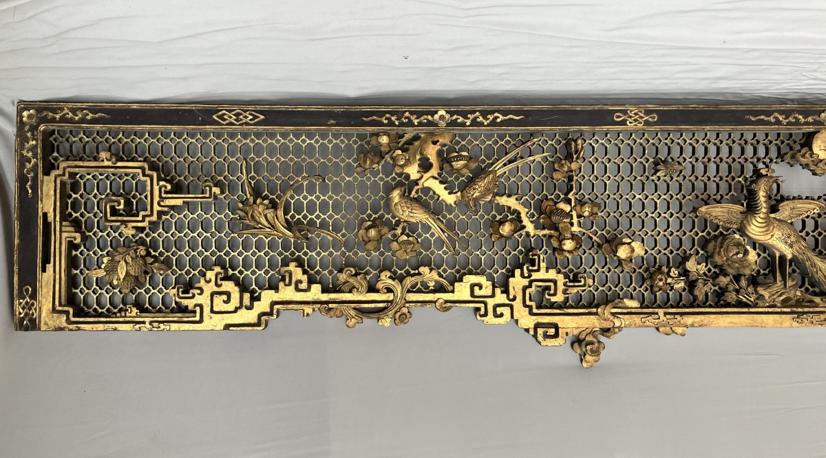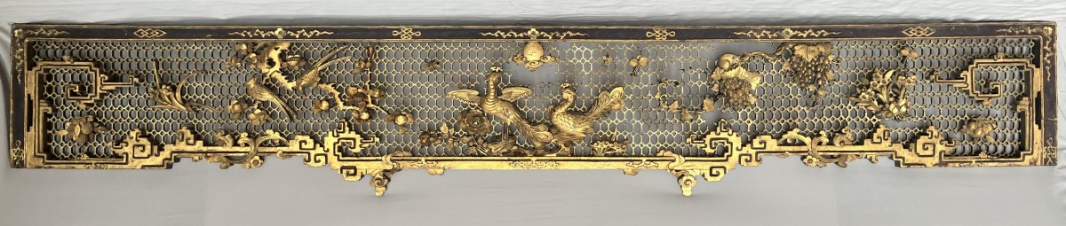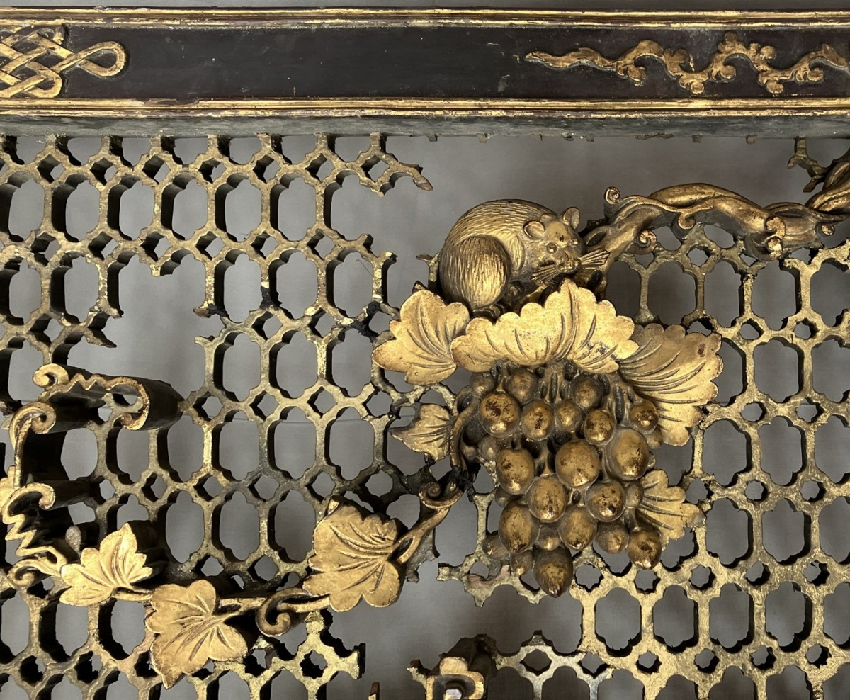 This colossal door frame is composed of three panels carved and sculpted from camphor wood, gilded with two shades of gold. On a honeycomb-patterned background, plants, fruits, and animals are carved in high relief. At the center of the pediment, a pair of phoenixes, symbols of the Empress, are visible. Two large vase shapes are carved into the side panels; it is likely that these two spaces were intended to hold vase silhouettes, either in transparent woven silk, painted glass, or porcelain. Importantly, halfway up each panel are pierced coins supported by bats. The coin on the left panel bears Manchu characters, and the one on the right panel bears Chinese characters. The presence of both Chinese and Manchu characters on the same object is found in 18th-century imperial artifacts. The four Chinese characters appear to mean "good omen, longevity, happiness under the star (sky)." The two Manchu characters, which can be translated as "Boo Kiyan," are found on imperial coins from the Qianlong period. These two marks, which the sculptor reproduced on the door frame, therefore represent a talisman, reversible on both sides, with a formula known in the 18th century.