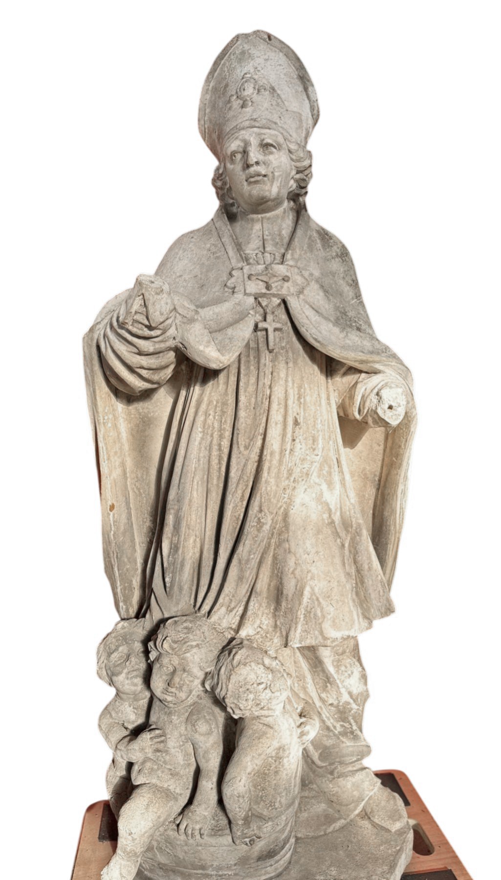 Wearing a mitre and a cope with ample, deeply carved folds, Saint Nicholas carries a pectoral cross and makes a gesture of blessing. Made of limestone, this work is likely from Burgundy and originated from a religious institution. It measures 130 cm long by 50 cm wide and 30 cm deep, and weighs over 200 kg.