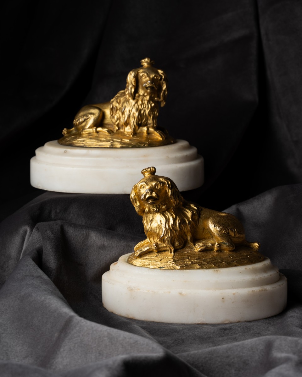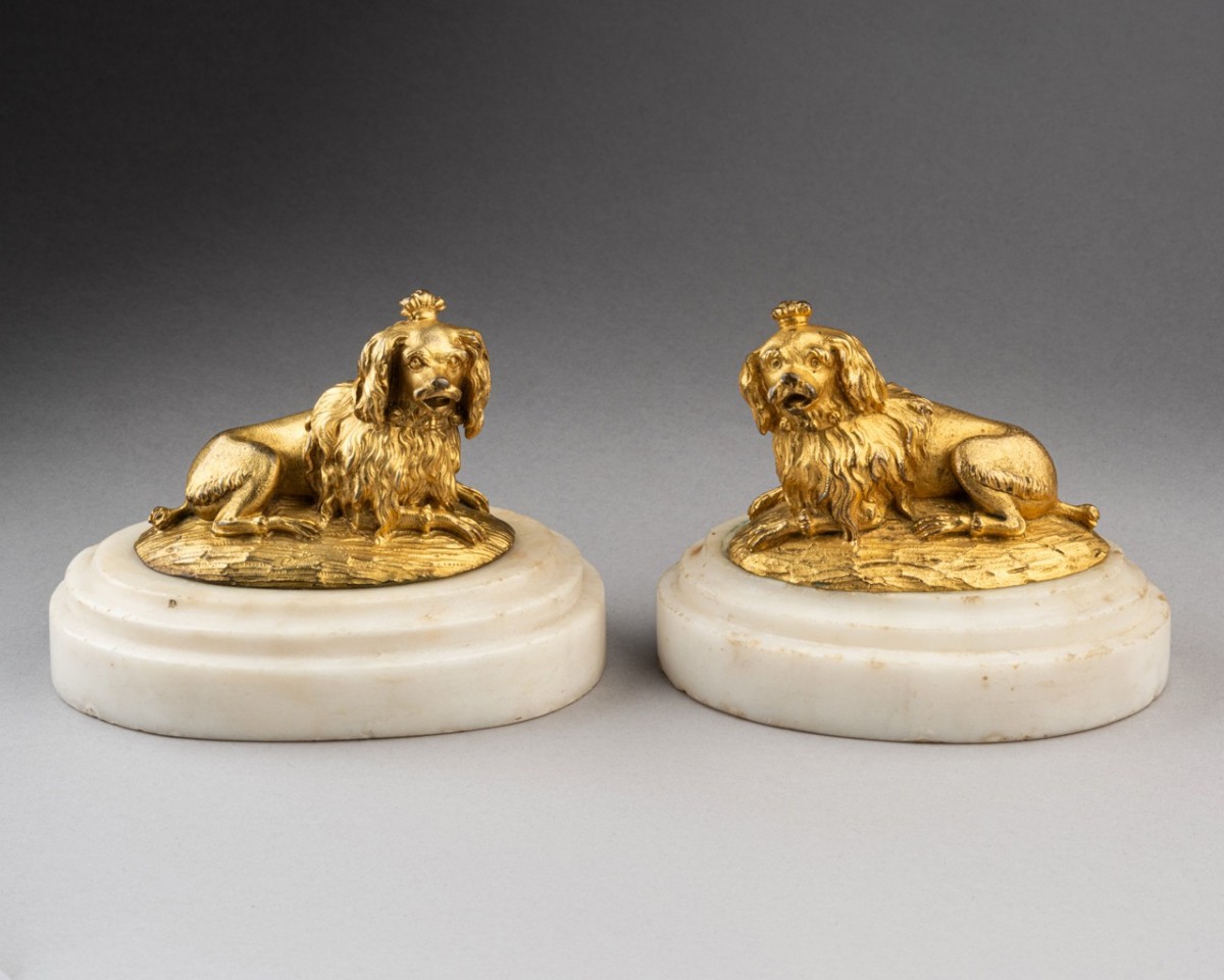 Many bronze dogs of this style have been identified — without much justification — as the pets of Marie-Antoinette or the Marquise de Pompadour. It is true that, in this case, the two dogs bear a certain resemblance to Inès and Mimi, the Marquise’s favorite dogs. They were immortalised in portraits by Christophe Huet, known today through several engravings by Étienne Fessard held at the Cabinet des Estampes. Inès and Mimi were also engraved based on drawings by Boucher in the Suite d'estampes gravées par madame la marquise de Pompadour d'après les pierres gravées de Guay. In these, the resemblance is no less striking, though ultimately inconclusive. All that can be said with certainty is that several similar or closely related models existed during the last two-thirds of the 18th century ; it can be assumed that the domestic animals used as models belonged to the great collectors of that era. Furthermore, the 1770 inventory of Philippe Caffiéri mentions “a firedog with a dog and a cat”, and a similar object was noted in the 1755 posthumous inventory of his father, Jacques Caffiéri. This is why, by tradition, gilt bronze statuettes representing dogs or cats — especially when they show such advanced modeling and chasing as seen here — have been attributed to the Caffiéri family.