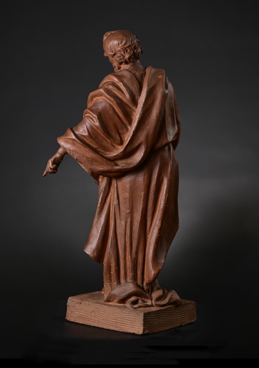 The spontaneity and vitality of the modeling are characteristic of terracotta bozzetti—preliminary sculptural sketches created by artists to work out compositions before executing final works in more permanent materials such as marble, stone, or wood. The term bozzetto (plural bozzetti) derives from the Italian word for "sketch," and these three-dimensional studies allowed sculptors to explore spatial relationships, gesture, drapery, and lighting effects in a malleable medium that could be quickly worked and revised. The immediacy of terracotta modeling preserved the artist's original creative energy, capturing the fluidity and emotion of the initial conception in ways that more laboriously executed final sculptures sometimes lost. The present terracotta bozzetto was presumably preparatory for a larger sculpture, perhaps an apostle figure intended for a church. Such apostle figures were commonly created in series for church decoration, flanking altars, adorning rood screens, or standing in niches along nave walls. However, as no connection to an existing work has been found yet, it is also entirely possible that this work was made for the market as an independent sculpture. Eighteenth-century collectors increasingly appreciated bozzetti as works of art in their own right, valuing them for the artistic spontaneity and creative process they revealed.