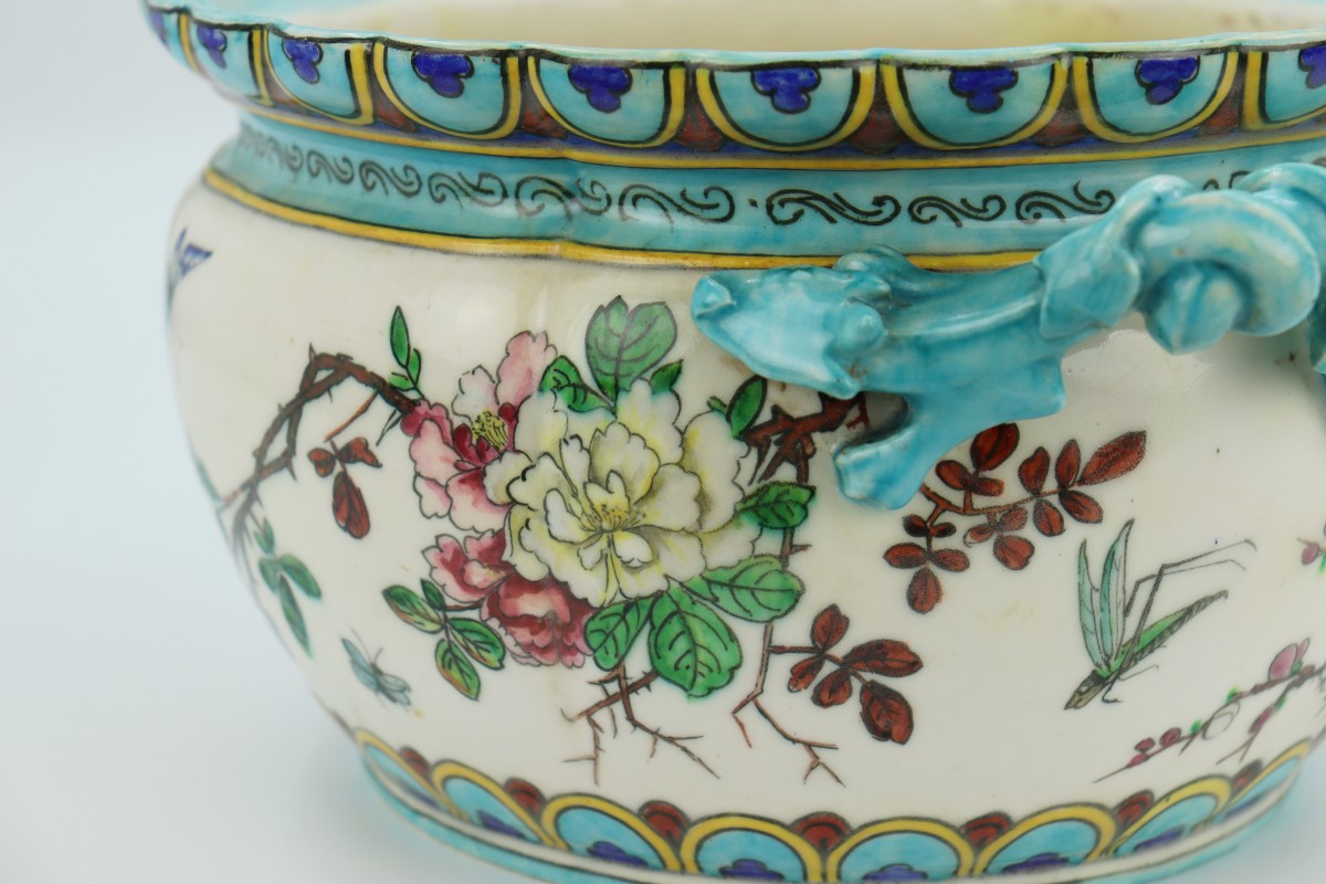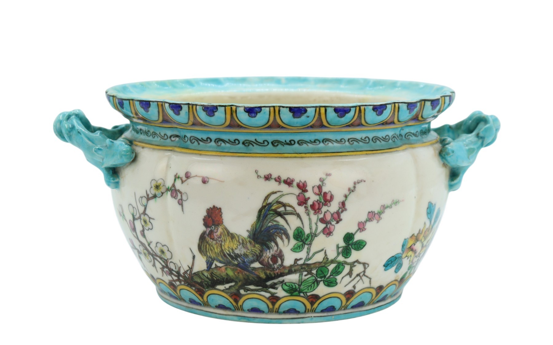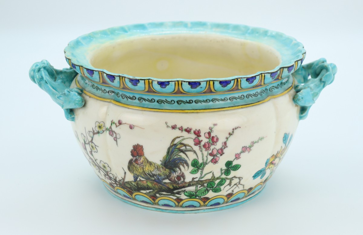 Large glazed earthenware planter with polychrome decoration inspired by the Far East, depicting a rooster, birds, butterflies, and flowering branches in slight relief on a cream background. Upper frieze decorated with blue and gold geometric motifs. Side handles in the shape of stylized dragons glazed in turquoise.