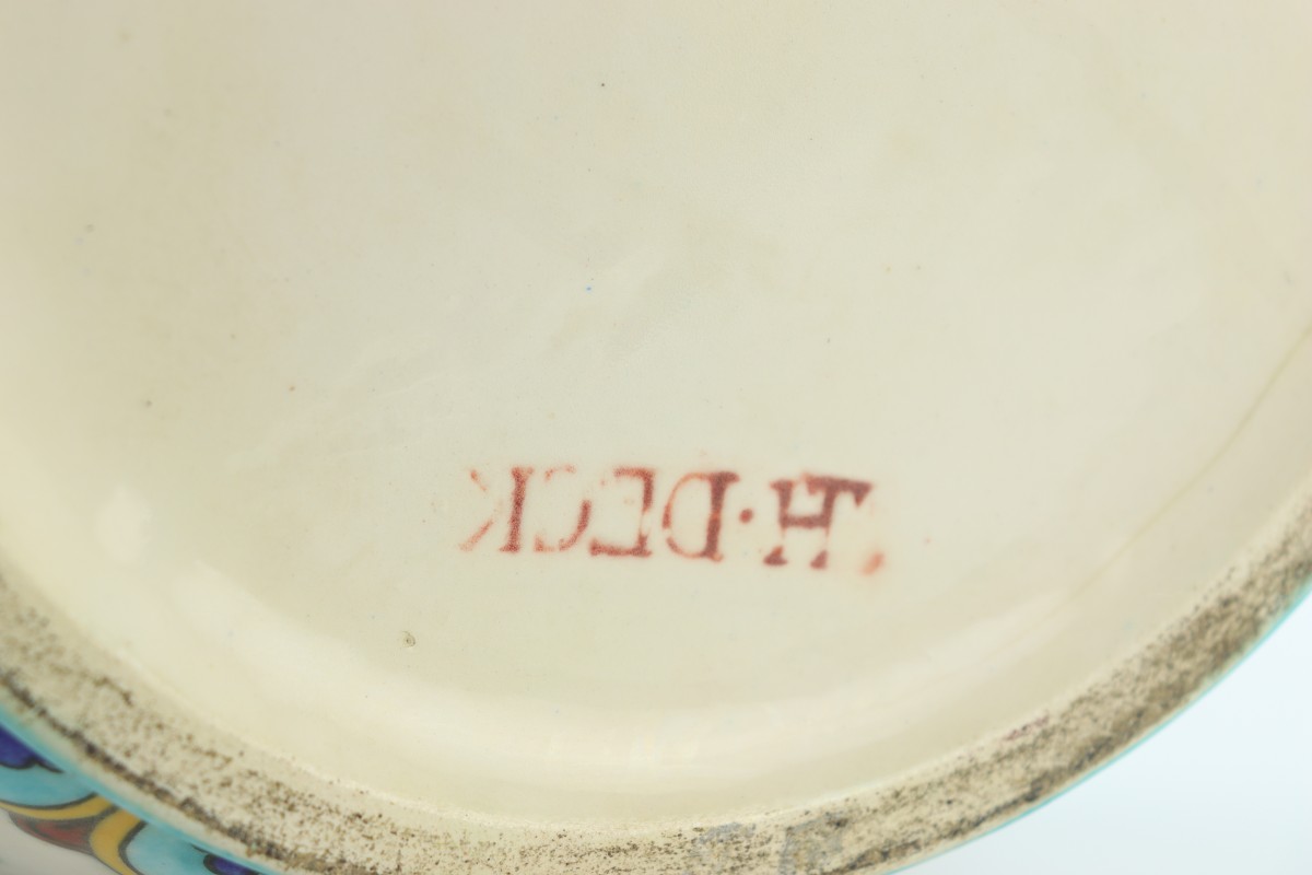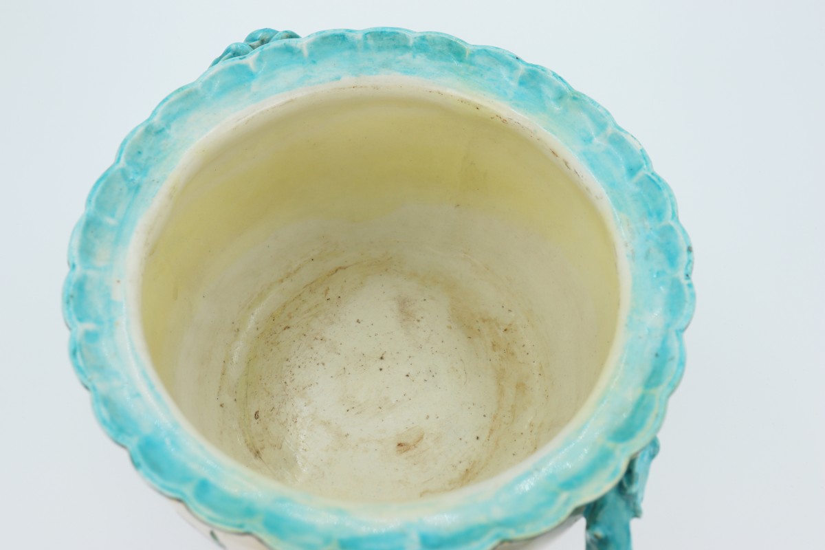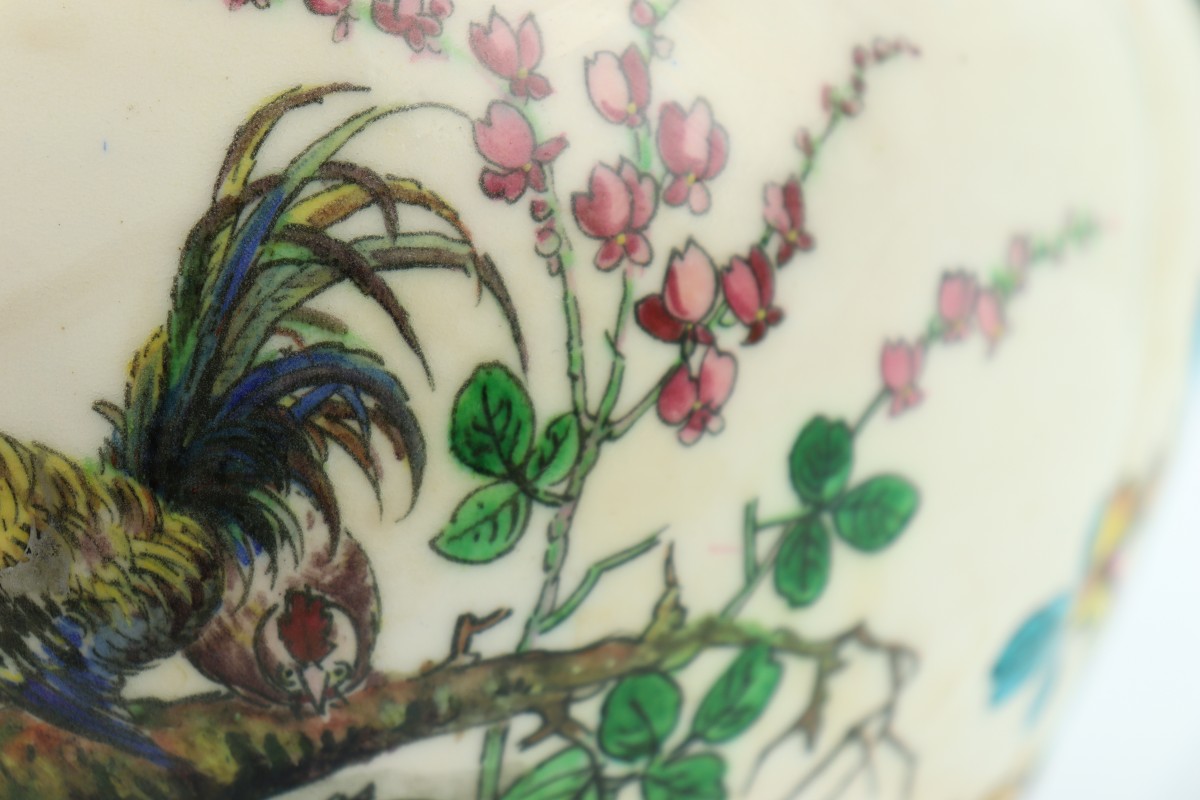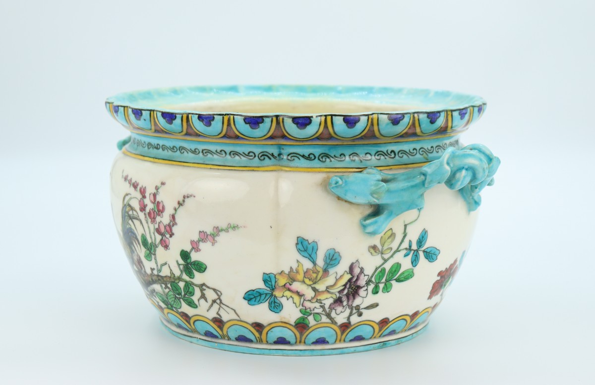 Large glazed earthenware planter with polychrome decoration inspired by the Far East, depicting a rooster, birds, butterflies, and flowering branches in slight relief on a cream background. Upper frieze decorated with blue and gold geometric motifs. Side handles in the shape of stylized dragons glazed in turquoise.