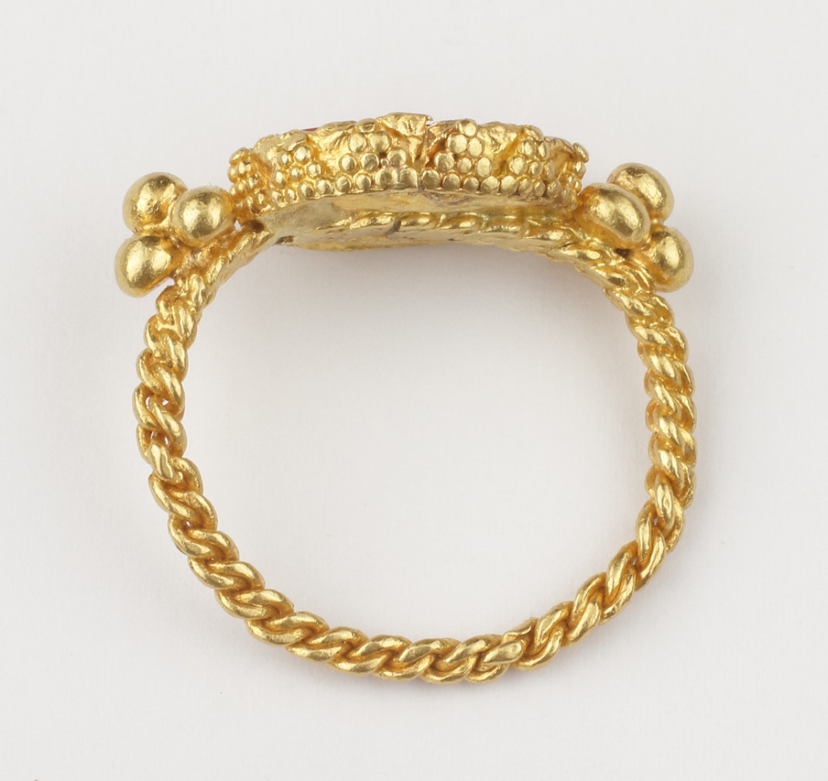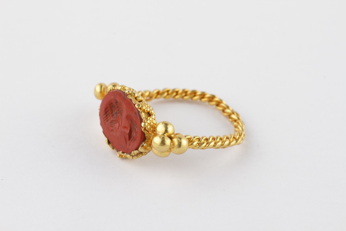 The gemstone depicts the empress in profile, her distinctive hairstyle of deeply ridged waves elegantly styled into a chignon. The portrait’s serene yet authoritative expression embodies the equilibrium between intellect and power for which Julia Domna was renowned. The intaglio is encased in an ornate oval gold mount, its edge granulated, and flanked by clusters of globules at the shoulders secured by a four-ply twisted gold wire hoop. This refined construction exemplifies the craftsmanship characteristic of high-ranking Roman jewellery from the Severan period. For comparison, a comparable intaglio of Julia Domna is housed in the collection of the Walters Art Museum (acc. no. 42.1218).