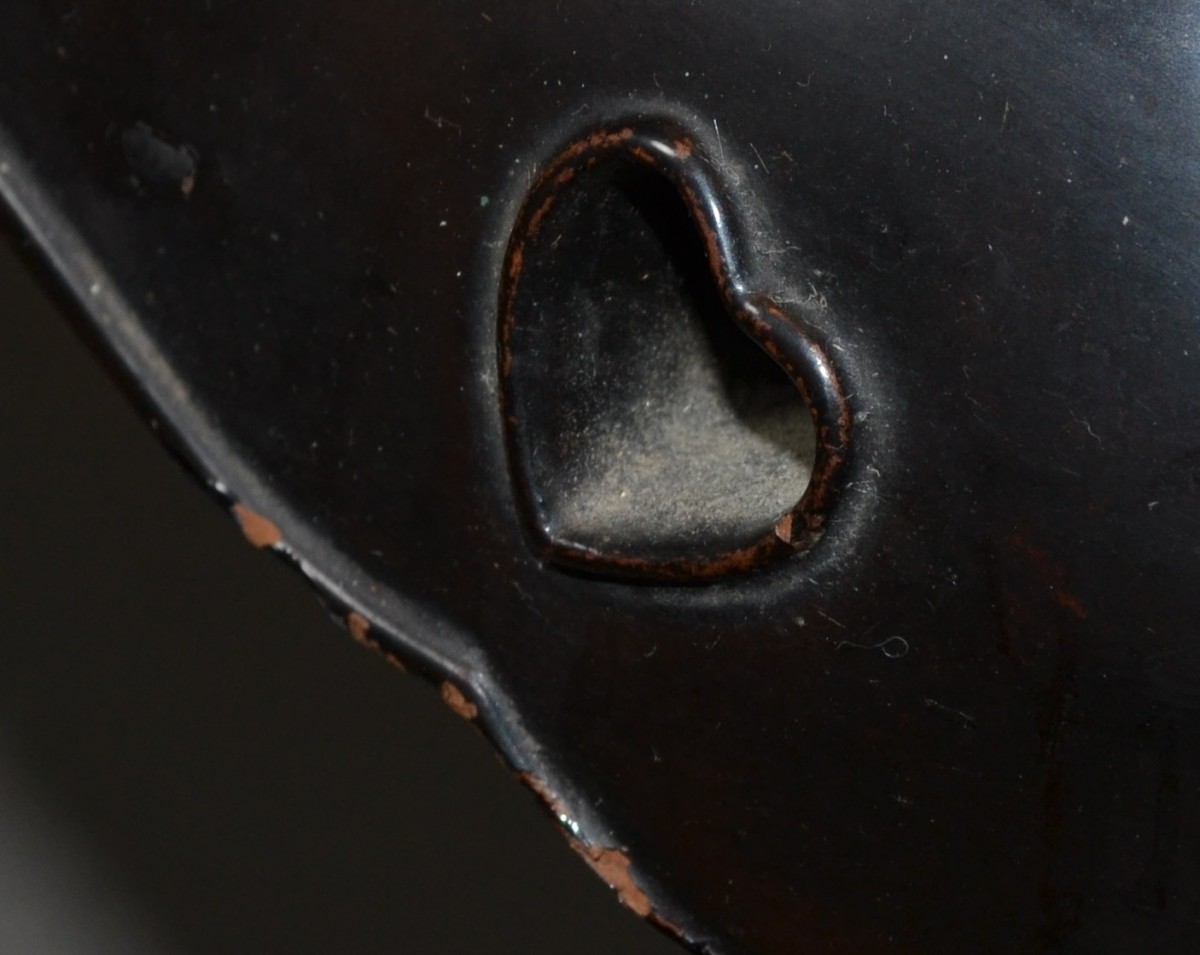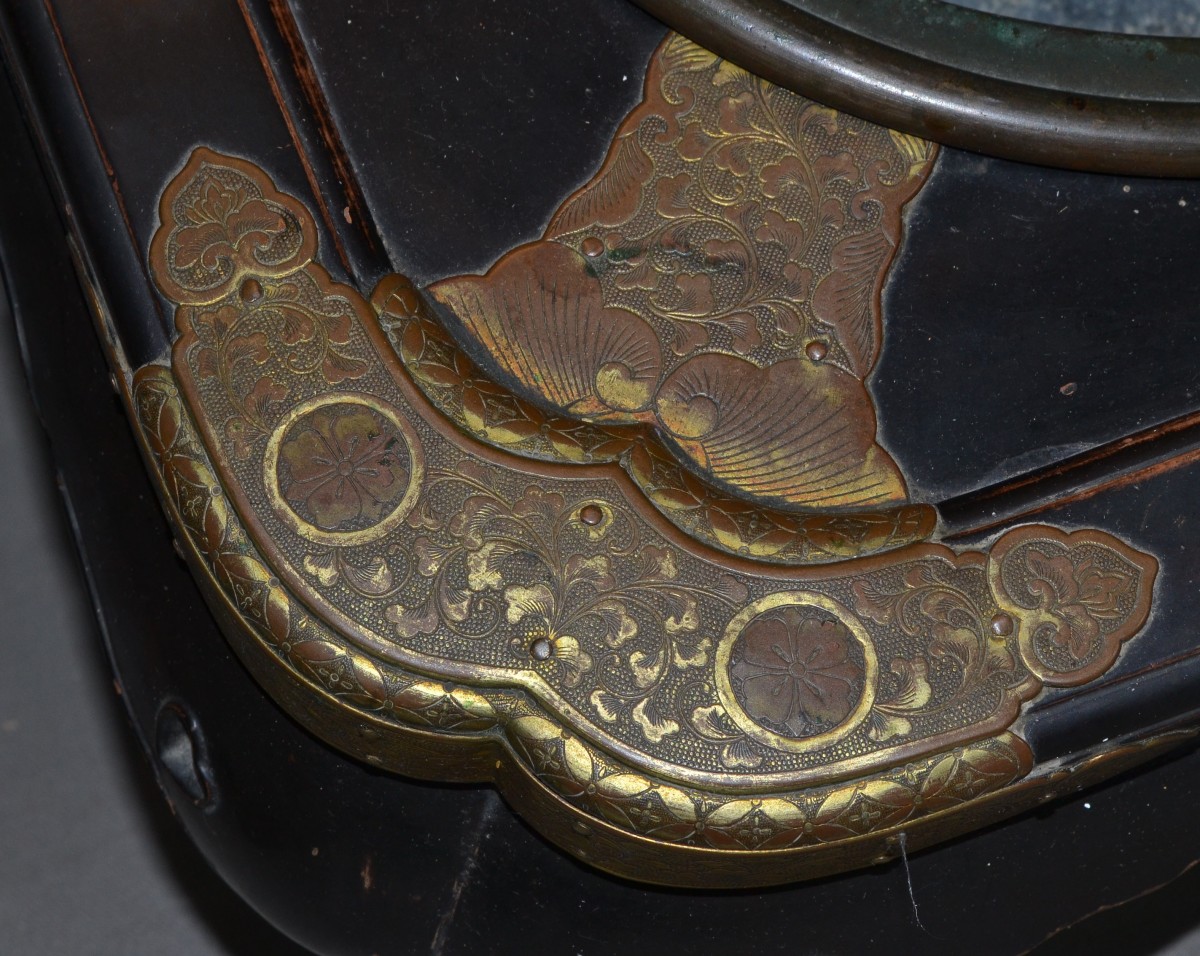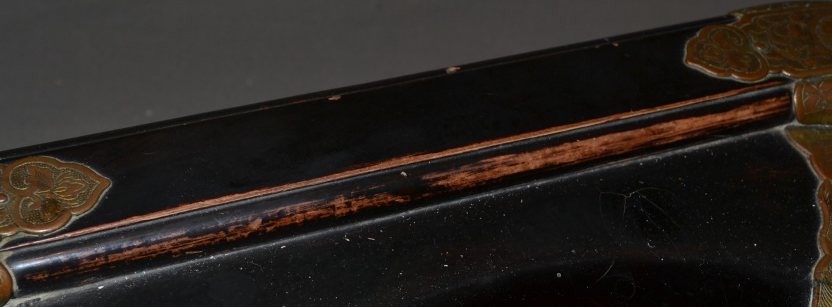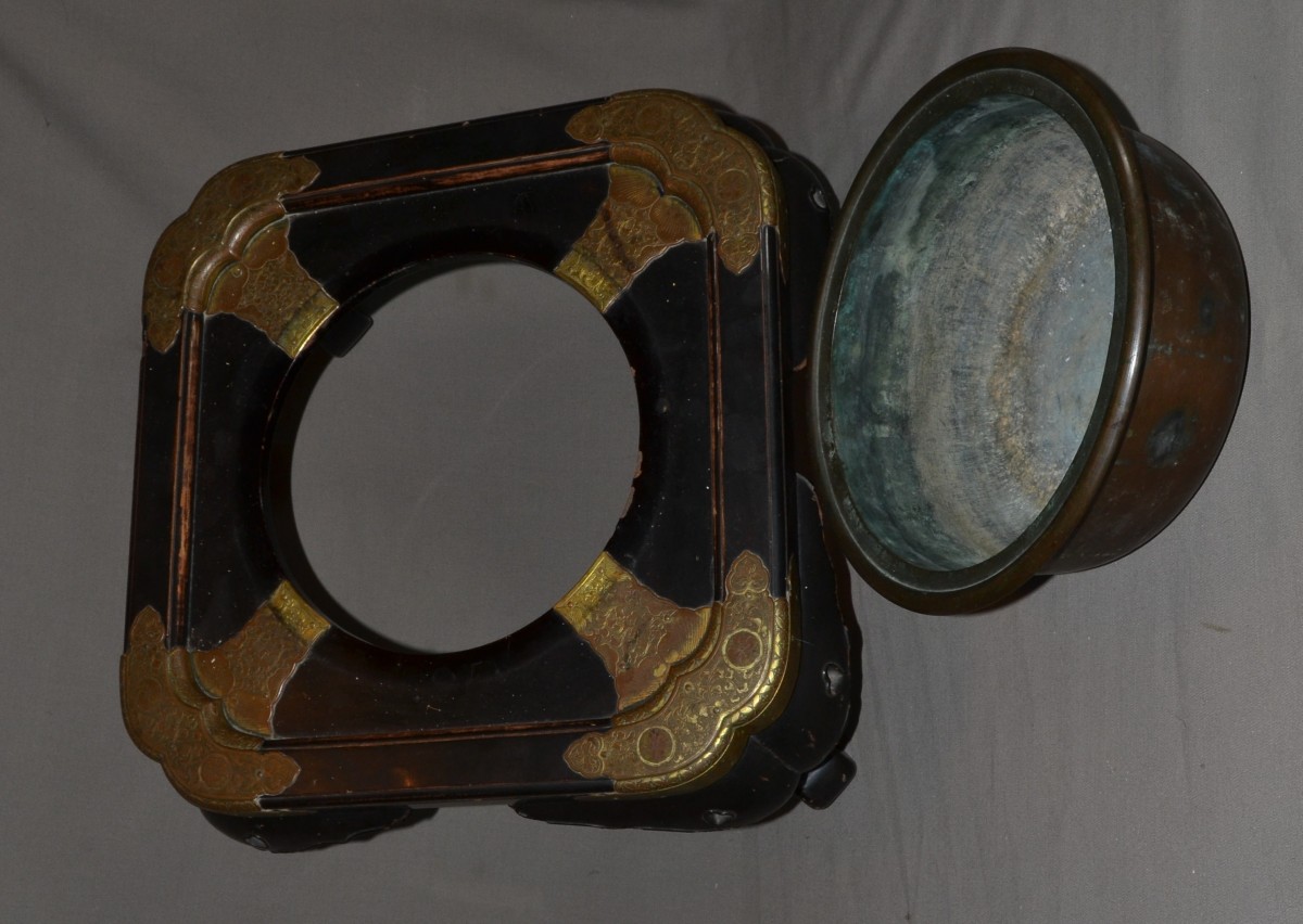 Wooden hibachi (probably Hinoki wood) covered in black Urushi lacquer (Roiro). The lacquer is remarkably durable, as was typical of early Edo period pieces. Despite centuries of intensive use, it has not chipped anywhere. It bears the marks of this use on the edges, where, due to wear, the wood is partially exposed. Two small heart-shaped cutouts aesthetically lighten the weight of the feet. It is worth noting that these hearts were carved in relief, requiring a much more complex polishing technique than for flat surfaces. The mounts are made of mercury-gilt copper, finely chased. While the gilding has almost completely disappeared from the top, it is well preserved on the sides and in the areas protected by the rim of the basin. There are Mon (clan crests) engraved on each fitting. The basin is made of hammered bronze; it is unusually thick and heavy, and was also created to last. Japan, Edo period, 18th century or earlier. 425 x 195 mm. Basin: 265 x 95 mm.