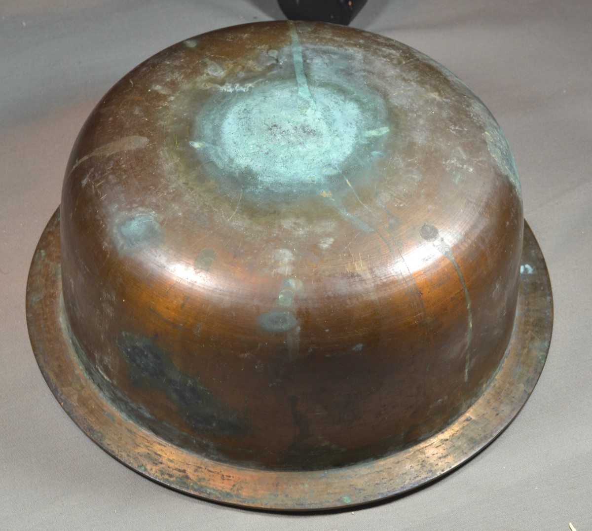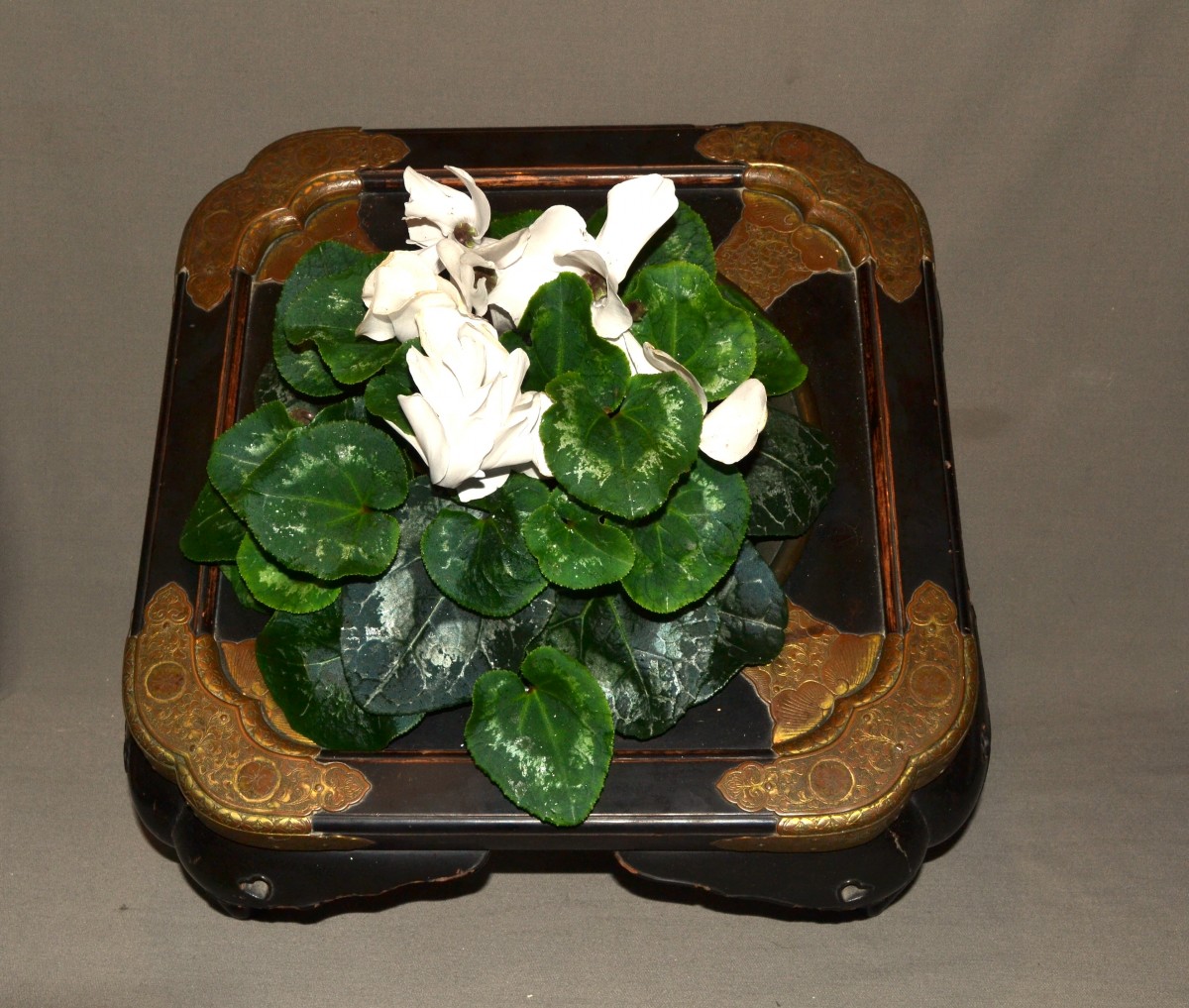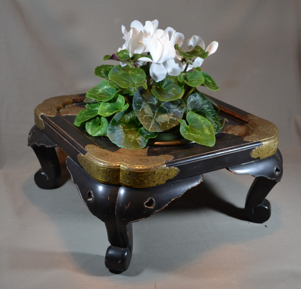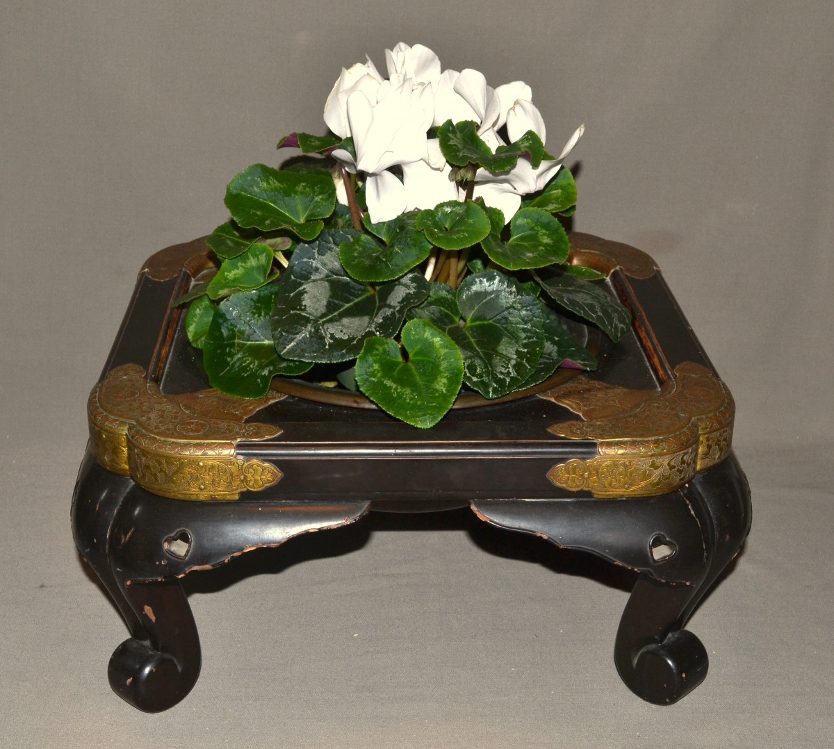 Wooden hibachi (probably Hinoki wood) covered in black Urushi lacquer (Roiro). The lacquer is remarkably durable, as was typical of early Edo period pieces. Despite centuries of intensive use, it has not chipped anywhere. It bears the marks of this use on the edges, where, due to wear, the wood is partially exposed. Two small heart-shaped cutouts aesthetically lighten the weight of the feet. It is worth noting that these hearts were carved in relief, requiring a much more complex polishing technique than for flat surfaces. The mounts are made of mercury-gilt copper, finely chased. While the gilding has almost completely disappeared from the top, it is well preserved on the sides and in the areas protected by the rim of the basin. There are Mon (clan crests) engraved on each fitting. The basin is made of hammered bronze; it is unusually thick and heavy, and was also created to last. Japan, Edo period, 18th century or earlier. 425 x 195 mm. Basin: 265 x 95 mm.