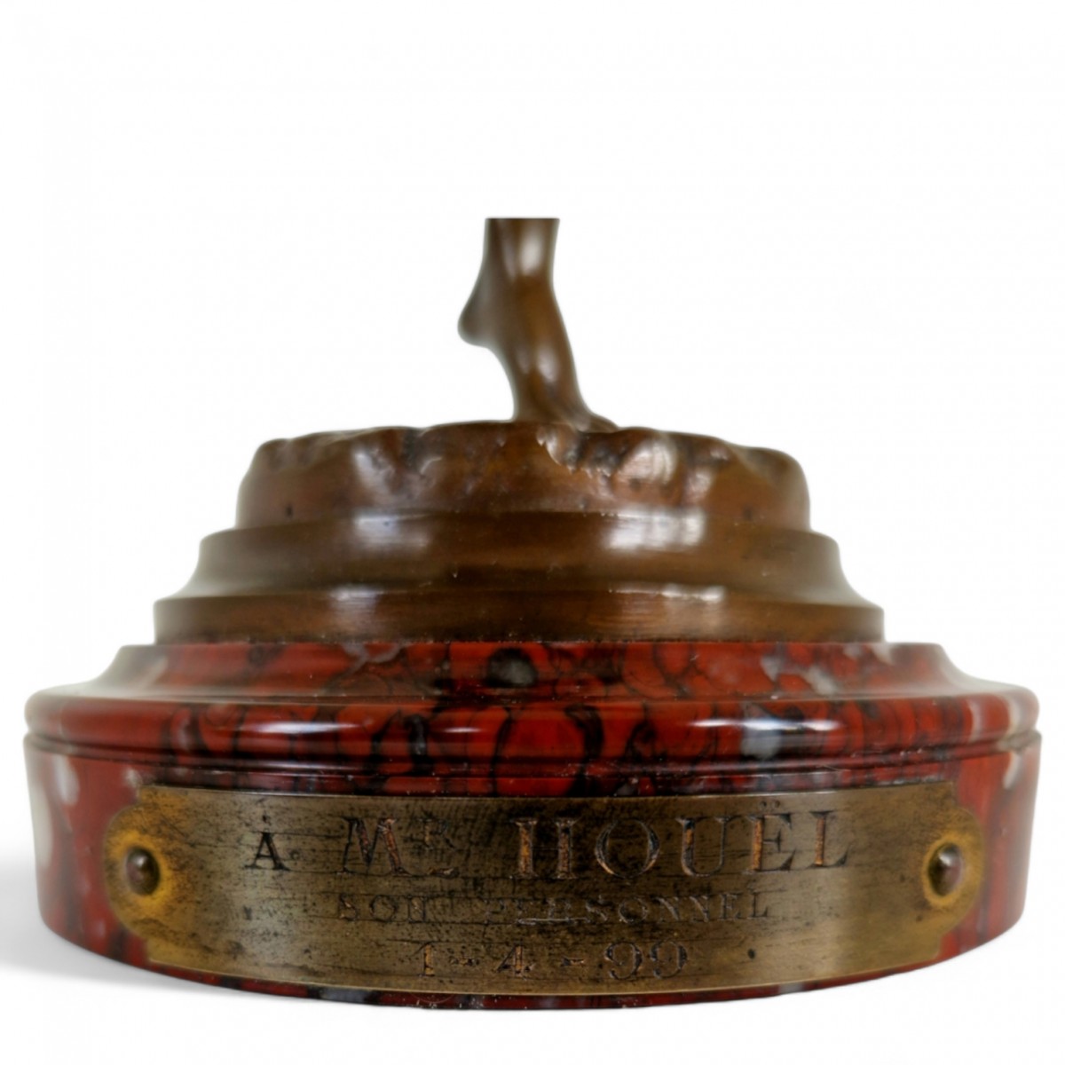 Bronze with brown patina resting on a morello cherry marble base. Signed "A.CARRIER" on the terrace. Founder's stamp "E. COLIN & CIE PARIS".