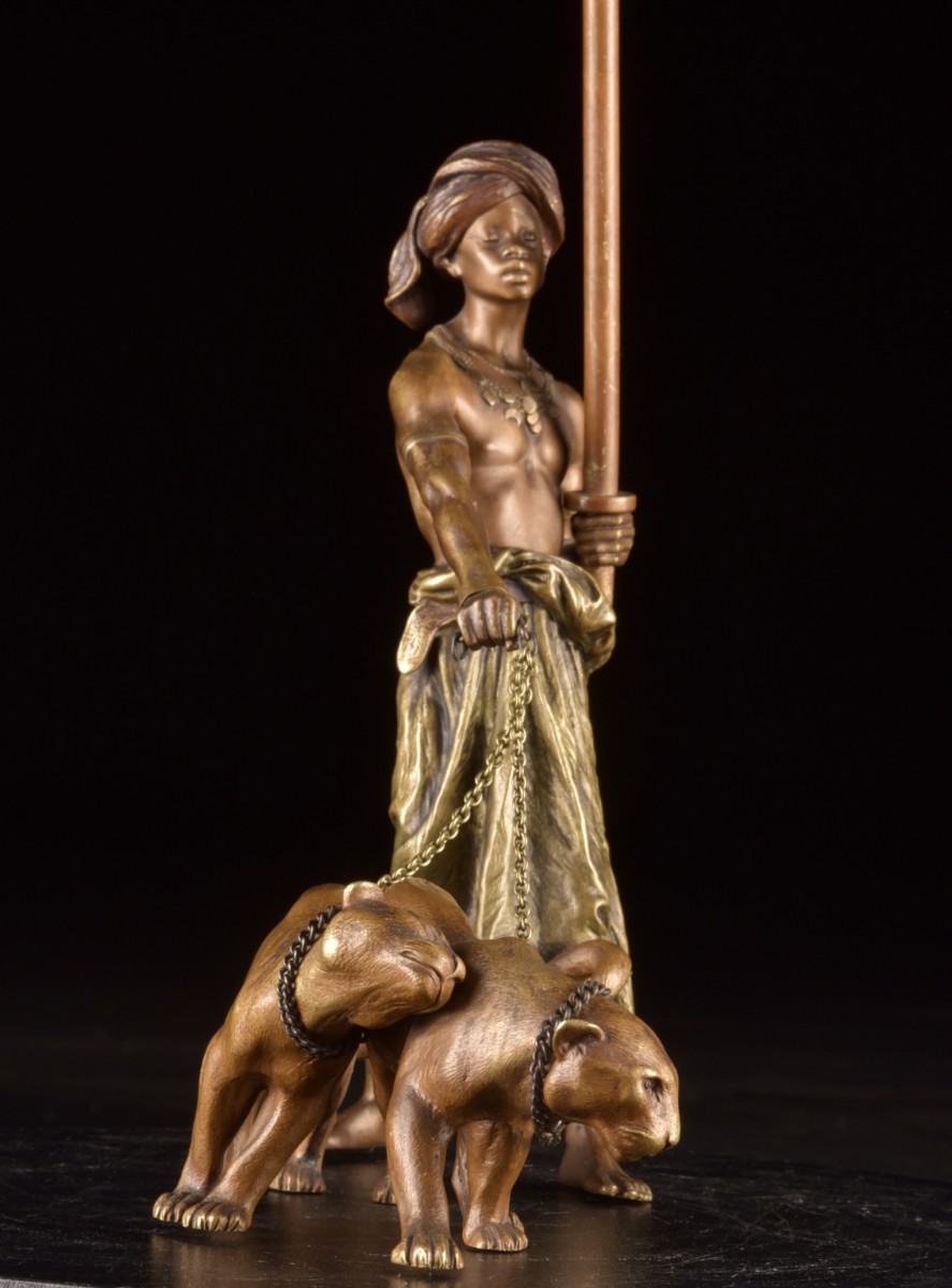 Orientalist Bronze Figure from Vienna with Panthers – Bergman Workshop, Vienna, circa 1900 (Model 8782) A rare and finely executed Viennese bronze depicting a young Oriental boy leading two panthers by means of chains. The figure stands with calm authority, holding a staff, while the powerful felines advance at his feet. The composition is both dynamic and elegant, perfectly reflecting the fascination with exotic and Orientalist themes that characterized Viennese decorative arts around 1900. Cast in bronze and finished with a rich polychrome cold patina, the sculpture testifies to the remarkable craftsmanship associated with the finest Viennese bronze productions. The naturalistic modeling of the panthers, the delicate rendering of the figure, and the finely worked textures of the drapery and ornamentation reveal the high quality of work from Franz Bergman's workshop. The piece bears the Bergman amphora mark and the inscription "GESCH." "(Protected design)" as well as the model number 8782, confirming its production in the renowned Viennese workshop of Franz Bergman, whose firm gained international acclaim for its imaginative and finely crafted bronze figures. Originally conceived as a lamp base, the sculpture retains the central stem intended to hold the lighting system, a characteristic element of Bergman's decorative production around the end of the 19th and beginning of the 20th centuries. It can nevertheless be perfectly displayed as a standalone sculptural work. Large-scale Viennese bronze compositions combining a human figure with several animals are considerably rarer than the small, individual figurines more commonly encountered. The presence of the two panthers, the Bergman mark and the original model number make this example particularly sought after by collectors of Viennese bronzes. Dimensions Sculpture: 24 × 21 × 10 cm Total height (with stem): 30 cm A highly decorative and collectible example of the famous Viennese bronze tradition of the early 20th century.
