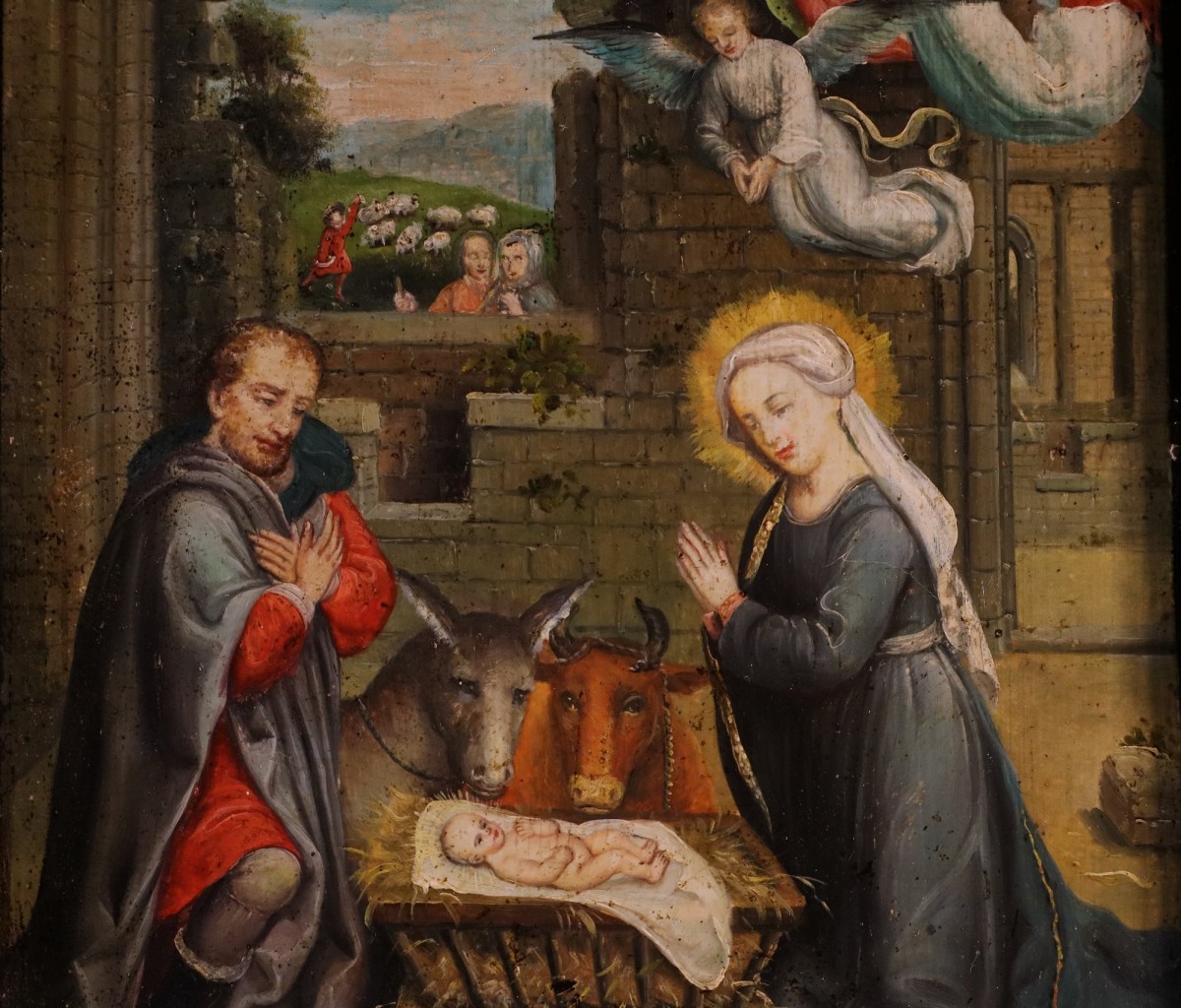 A curious and unusual detail concerns Joseph, who is represented here as a young man, unlike most depictions. The detail of the angels of the heavenly host gathered at the site of the divine event, high up on the right, is beautiful, as is the glimpse of the background through an opening, from which shepherds can be seen in a hilly landscape, giving the work an evocative atmosphere of contemplation.