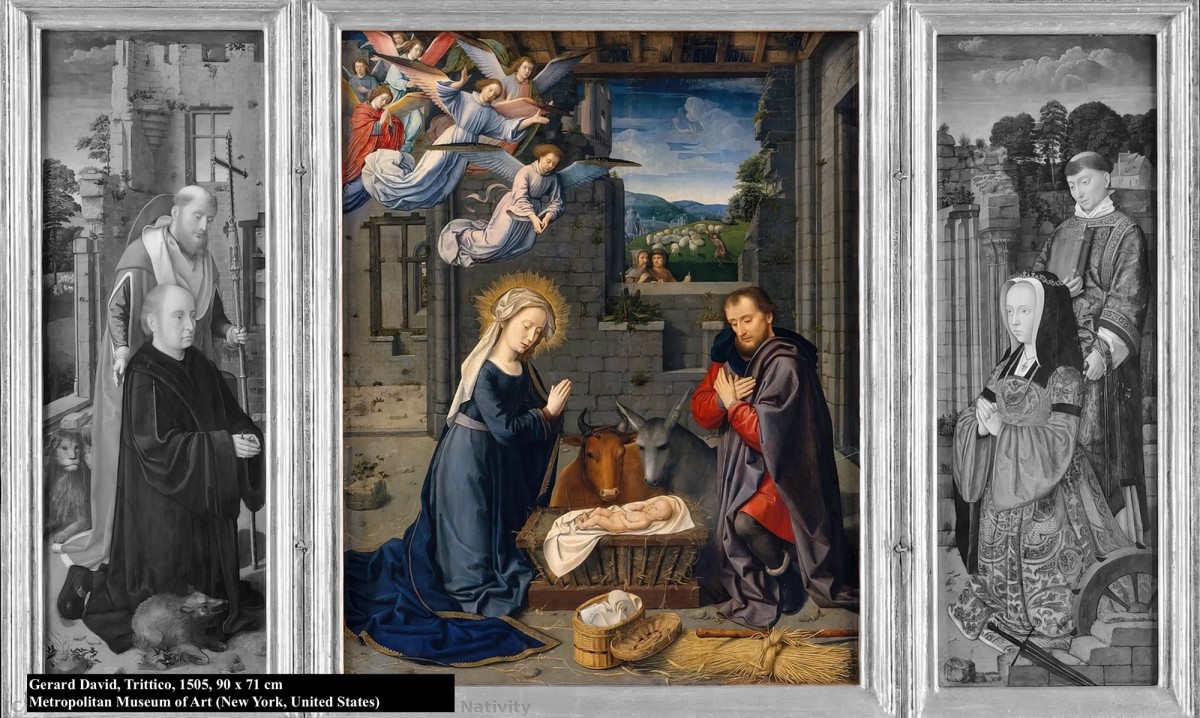 The setting is also very evocative, faithfully replicated from the original prototype, which is based on the passage from the Gospel of Luke (Luke 2:7): according to tradition, the family could not find shelter in any inn and chose to protect the child inside the dilapidated palace of King David of the Old Testament, an ancestor of Christ. **Gerard David, Triptych, 1505, 90 x 71 cm Metropolitan Museum of Art (New York, United States)