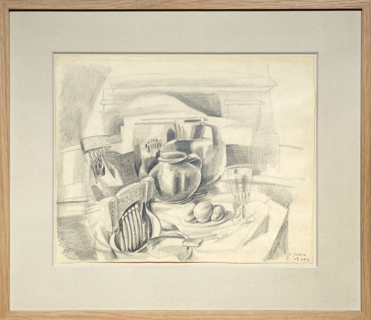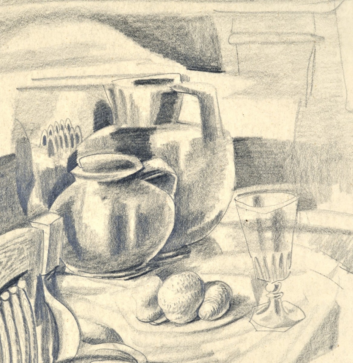 This drawing is a typical work by Andalusian artist Ismael de La Serna in the 1930s, when he reached full maturity in his art after spending ten years in Paris. His style at that time was characterized by a subdued Cubism, with which he brilliantly revisited one of the great themes of Spanish Golden Age painting: the "bodegón," a composition of cooking objects, in between a still life and an interior scene.