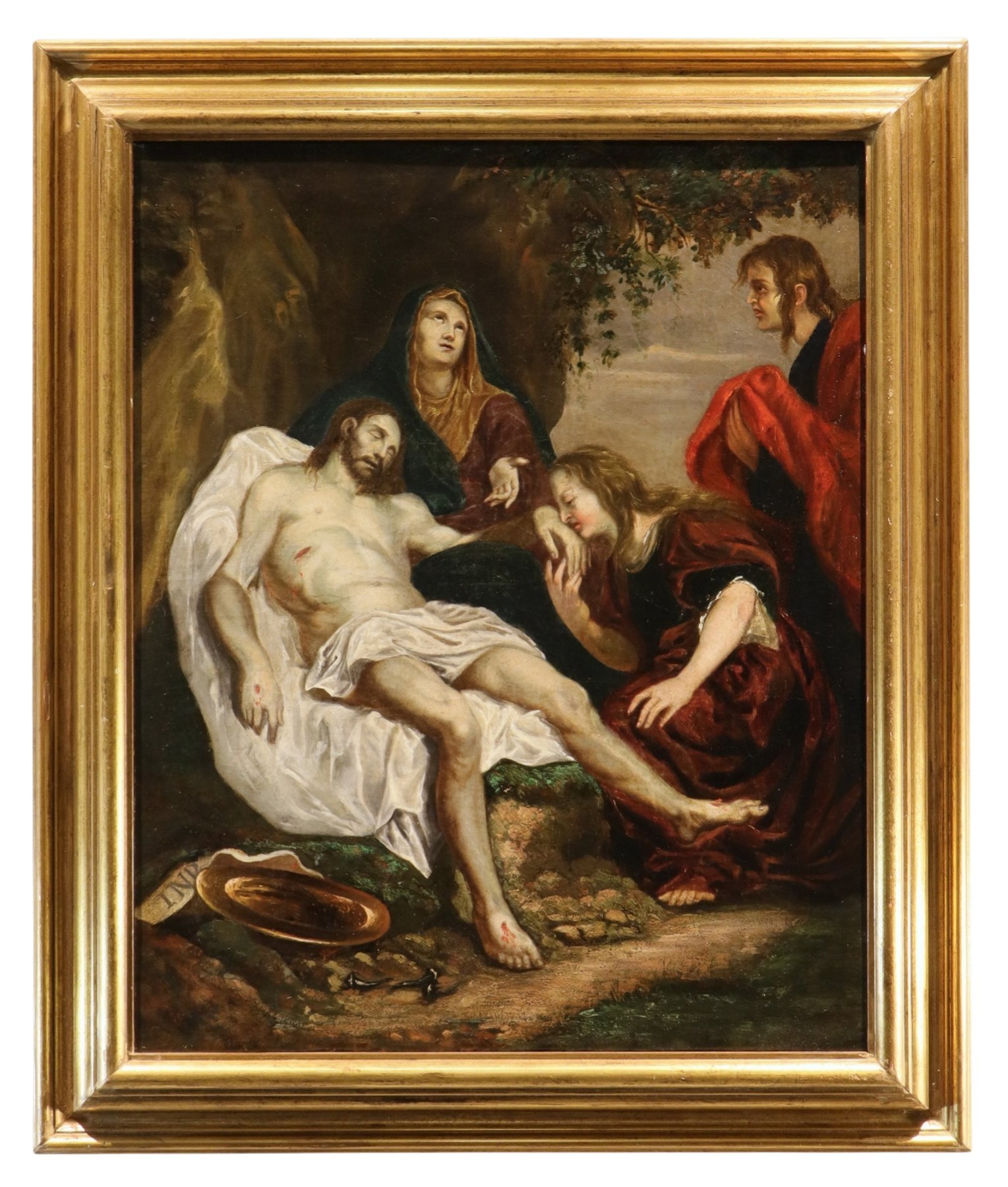 The iconography of our Lamentation, like the whole of Van Dyck's series, became emblematic of this poetics. The focal point of the composition is the wounded hand, kissed by Mary Magdalene, and the theme of the work is meditation on the Passion of Christ, also evoked by the instruments of torture in the foreground.
