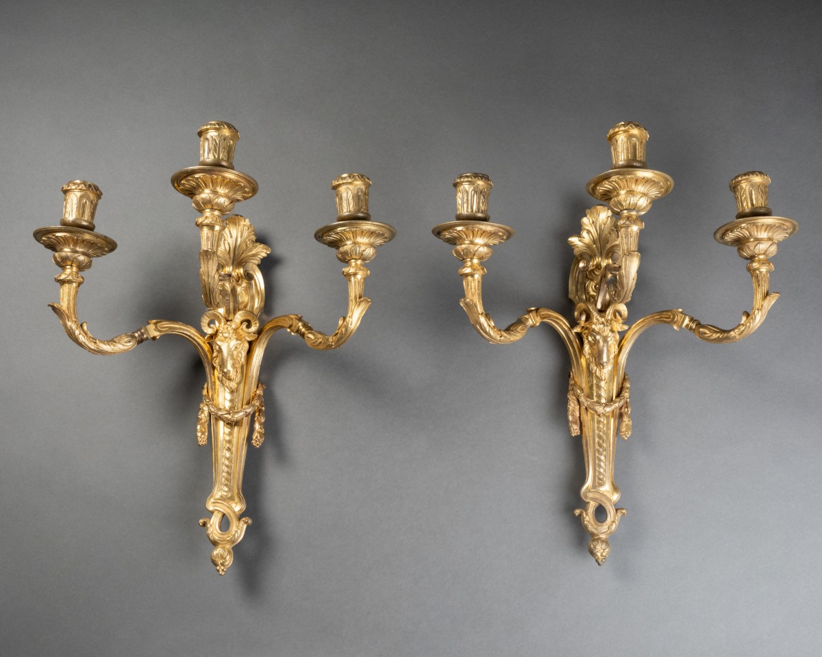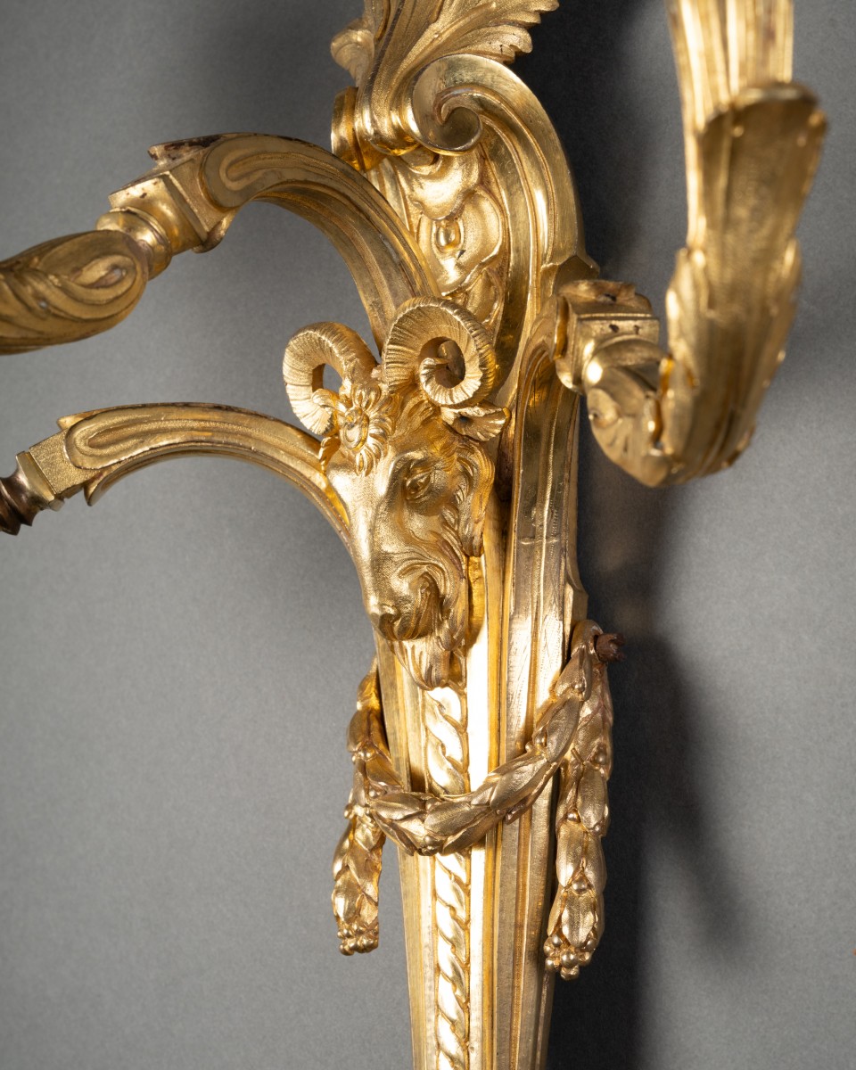 Our opinion: The extreme rarity of our Far Eastern model and the presence of three light arms suggest a rather prestigious commission. The exquisite fineness of the chasing, particularly that of the ram's head protomes, meticulously cold-worked, as well as the breadth and richness of the mercury gilding, attest to the work of a leading bronze craftsman. These characteristics link our pair of wall sconces to pieces produced at the end of Louis XV's reign by the major Parisian workshops specializing in bronze furniture, such as Philippe Caffieri (1714-1774) or Pierre Gouthière (1732-1813).