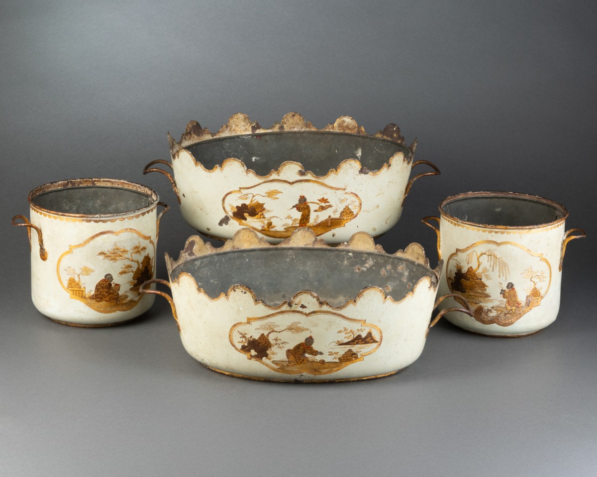 Gilt handles, rims, and cartouche borders. Original removable zinc interiors.
