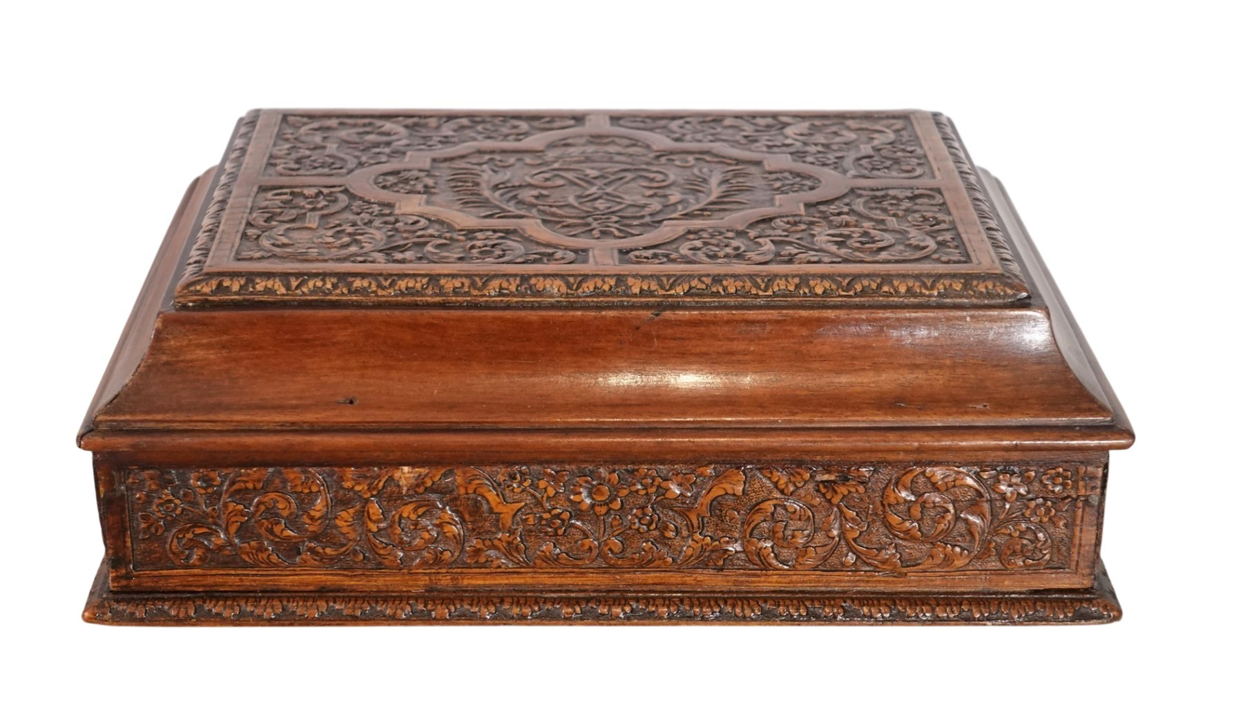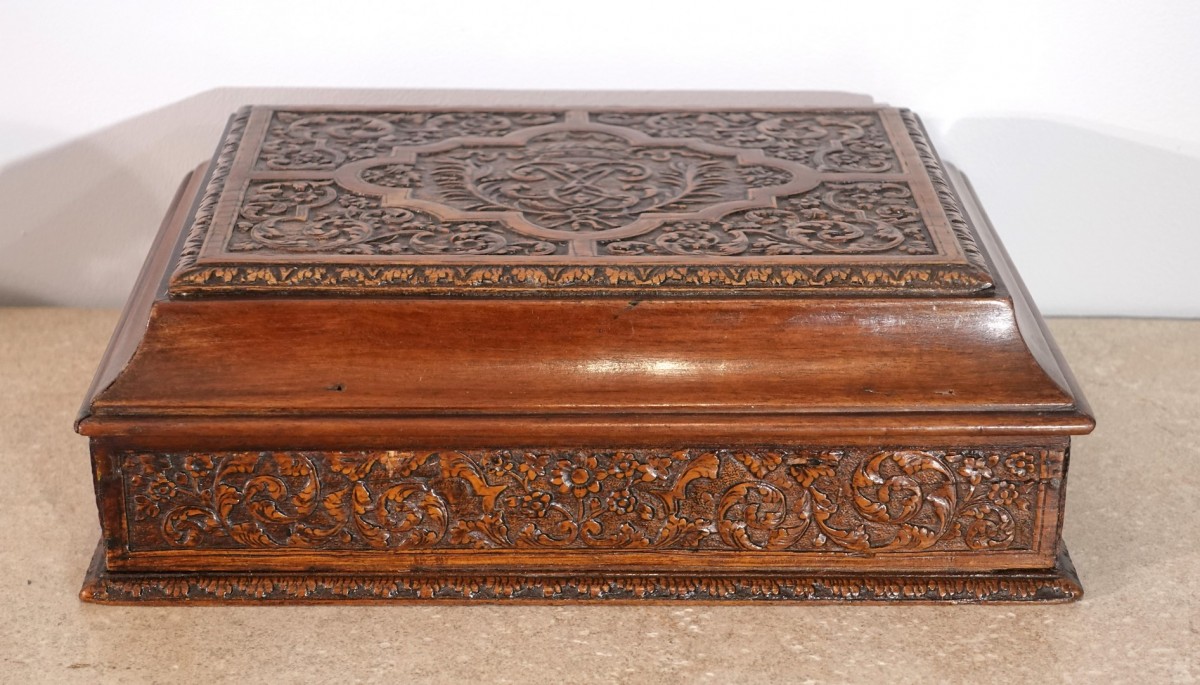 Charming rectangular casket in Sainte Lucie wood, carved on all sides and on the ogee-shaped lid, with a rich decoration of scrolls, arabesques, small flowers, and plant motifs.
