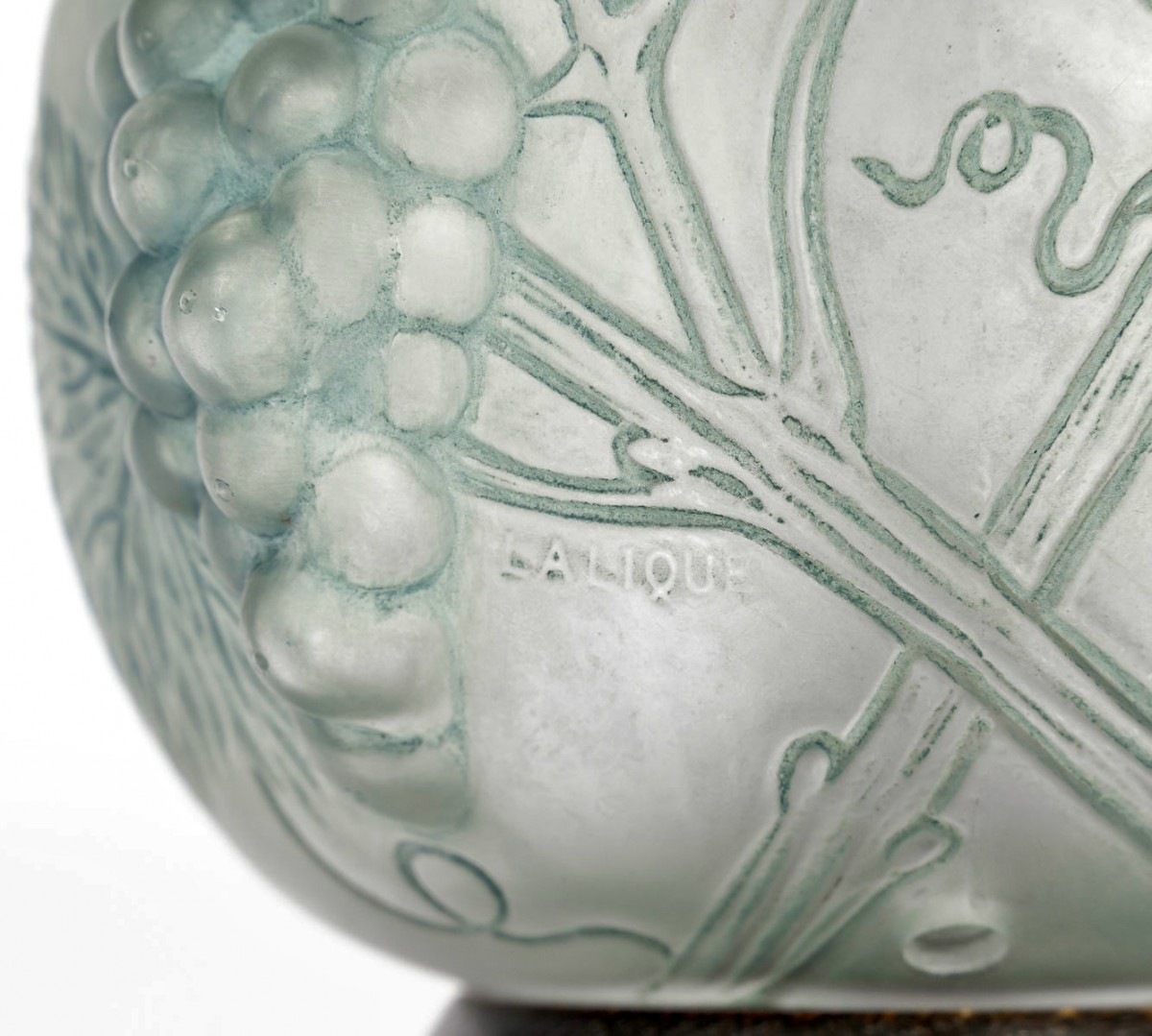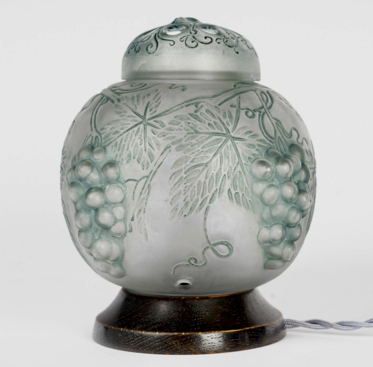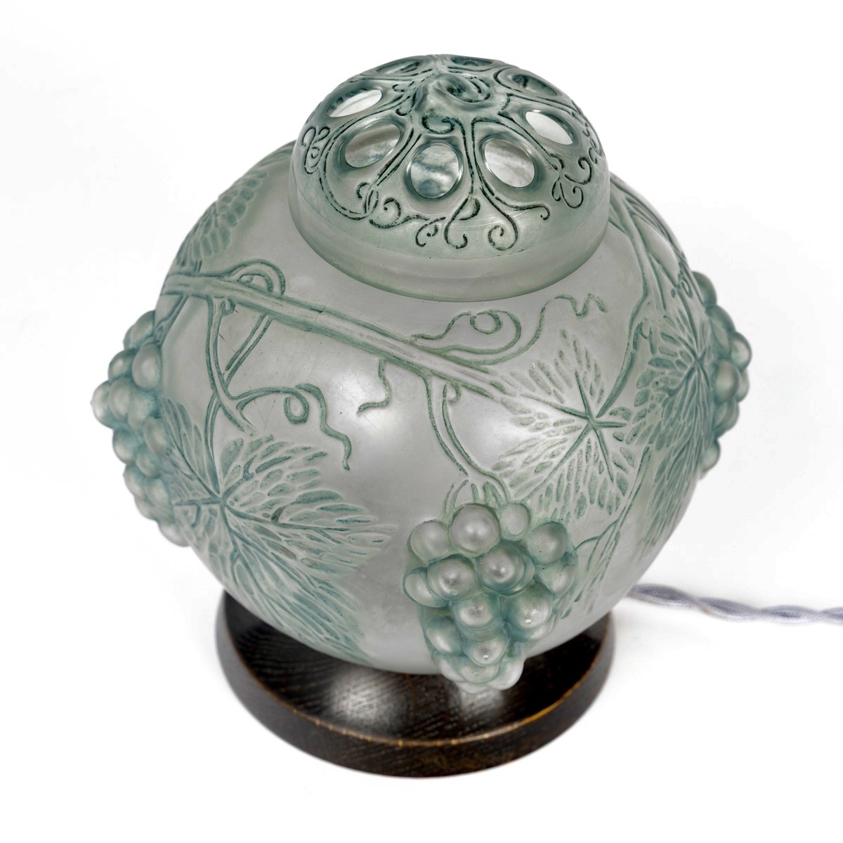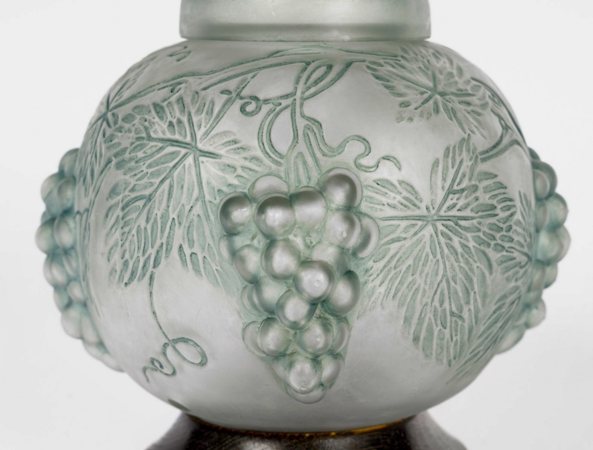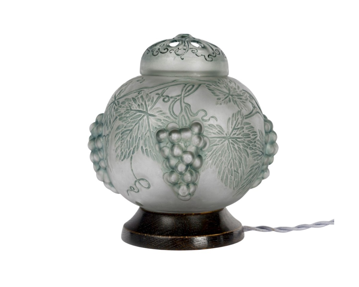 Lamp Perfume Burner "Raisins" (Grapes) made in glass with blue-grey patina by René Lalique in 1921.