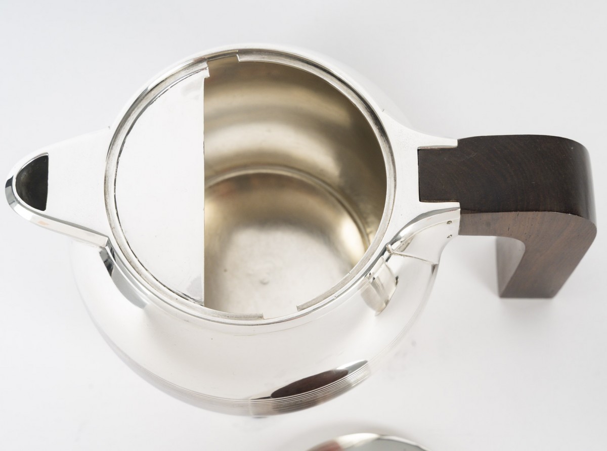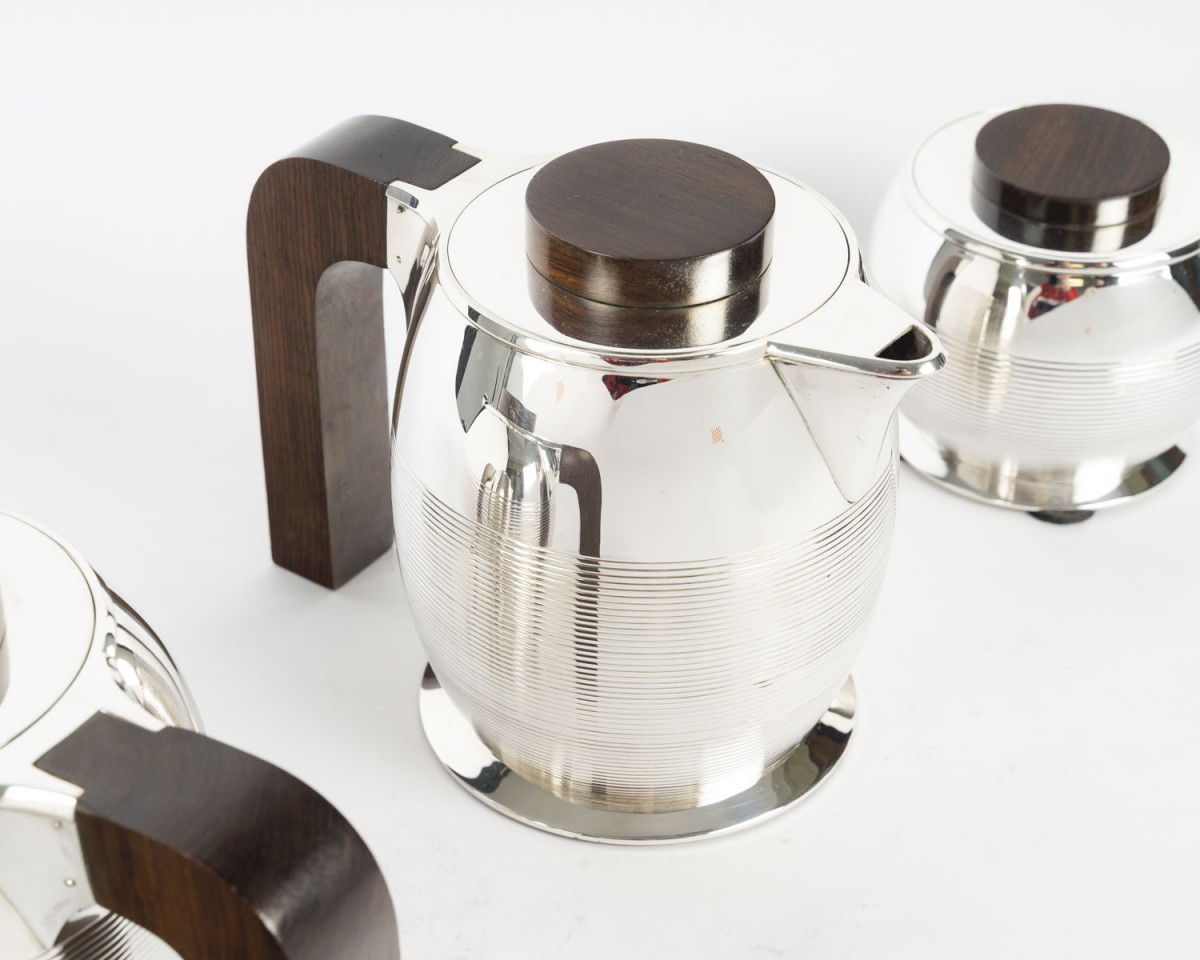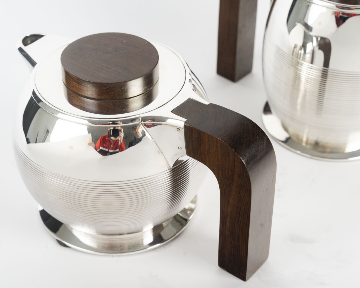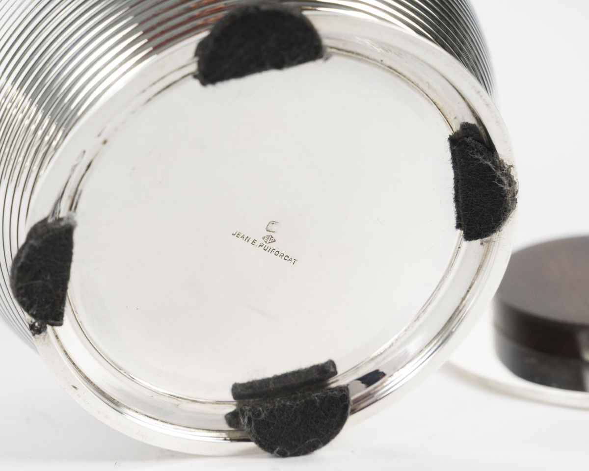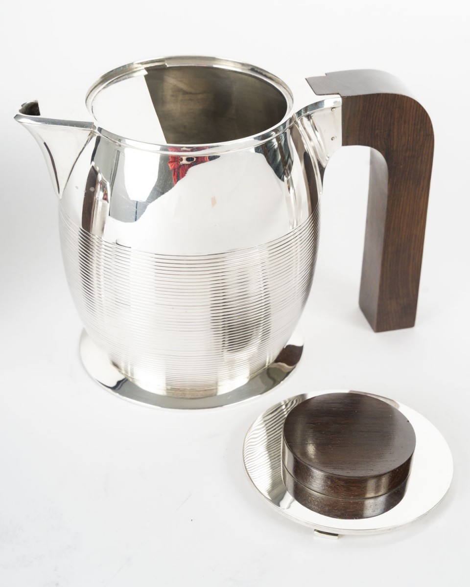 Through the purity of its forms, the precision of its proportions, and the balance between polished metal and dark wood, this set perfectly illustrates the modernist and functional spirit that characterized Puiforcat's production between the two World Wars.