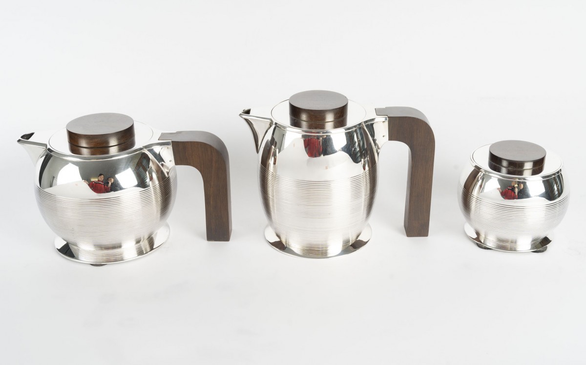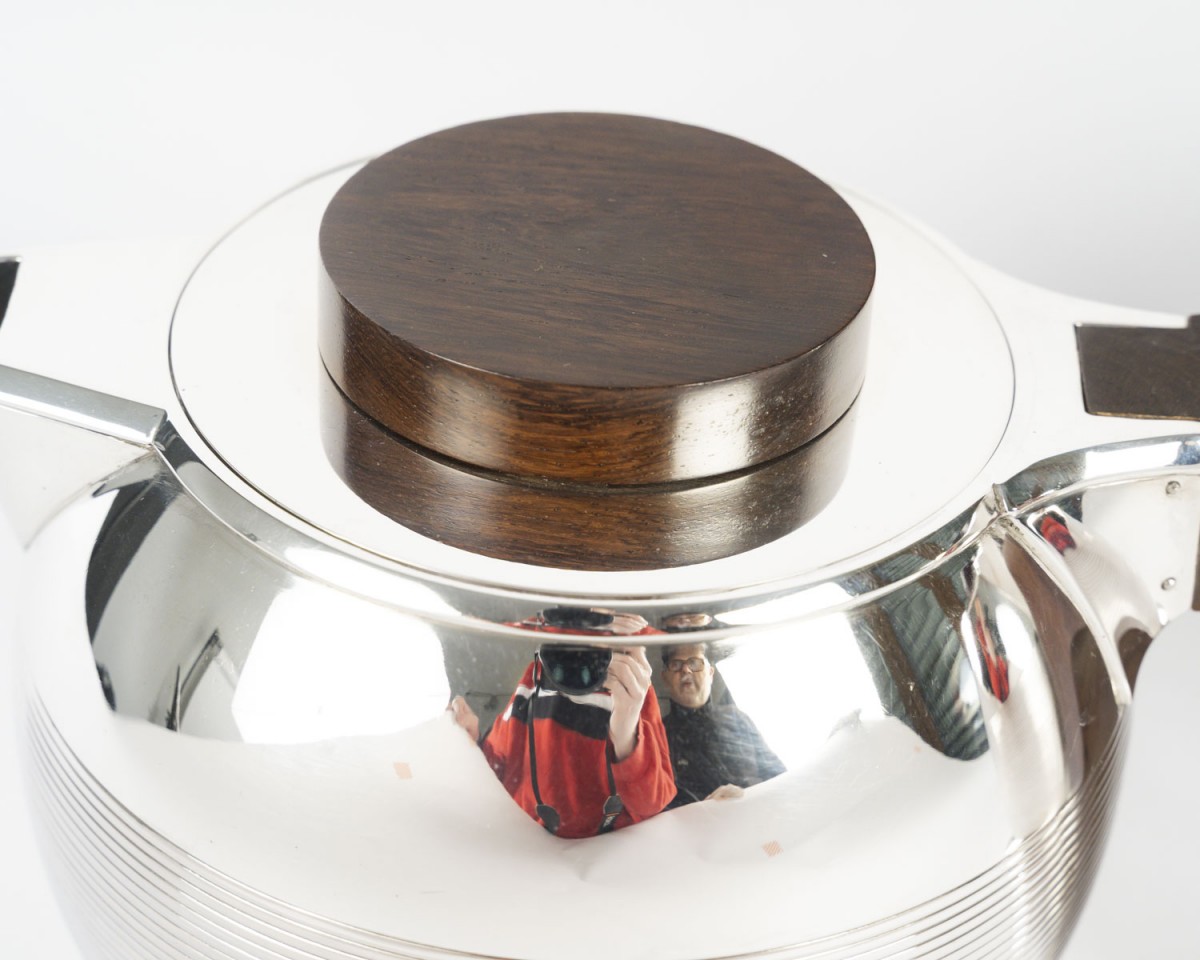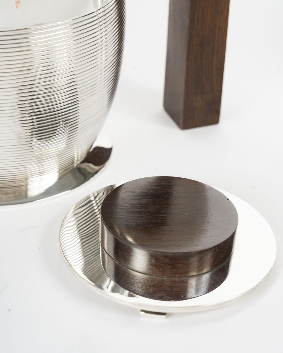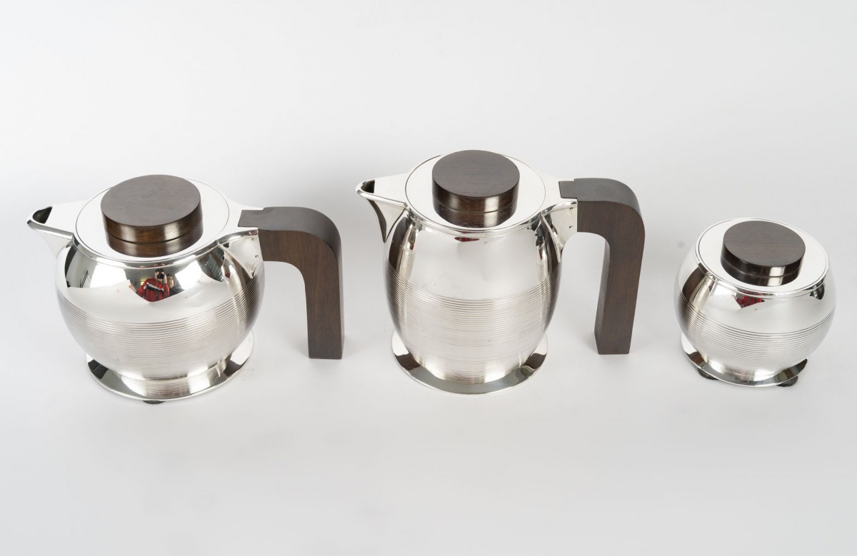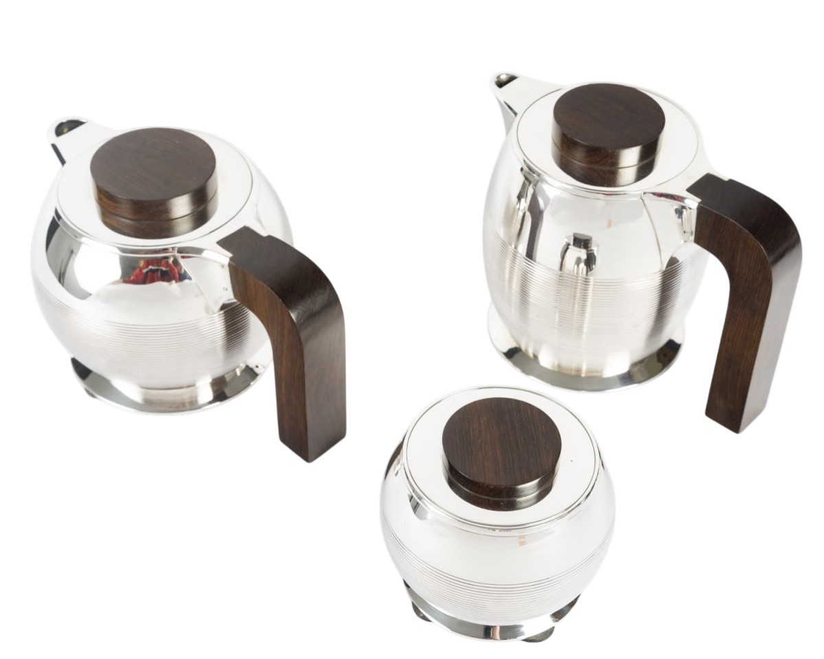 Through the purity of its forms, the precision of its proportions, and the balance between polished metal and dark wood, this set perfectly illustrates the modernist and functional spirit that characterized Puiforcat's production between the two World Wars.