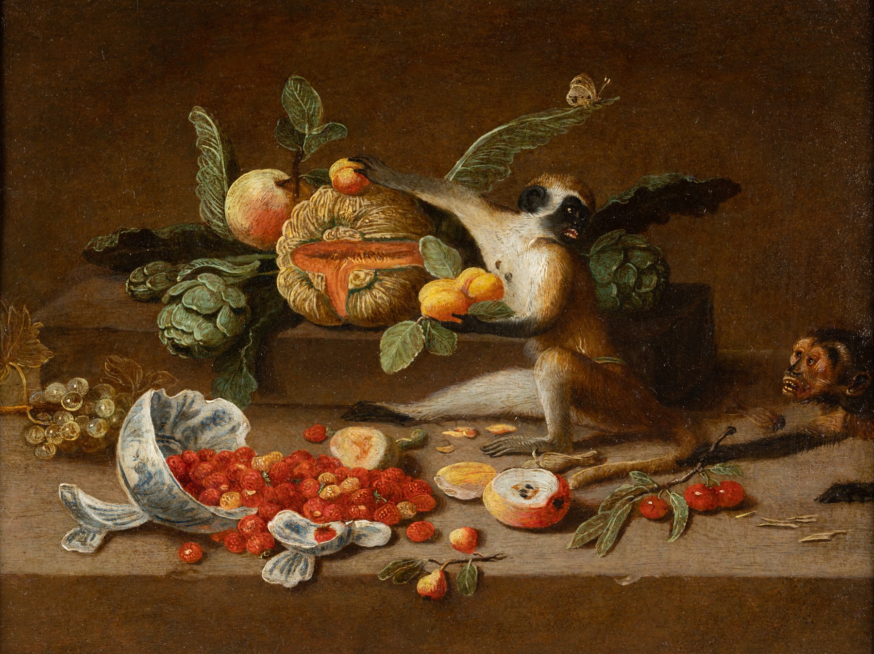 We see the contemporary fascination with the exotic in both the little monkeys and the broken Wanli bowl. A Wanli bowl is a piece of Chinese porcelain from the Ming dynasty (reigned 1573–1620), famous for its blue and white decorations, often characterised by compartmentalised designs or figurative landscapes. These bowls were intended for export. Inert and broken, the porcelain contrasts with the dynamism and vigour of the monkeys.
