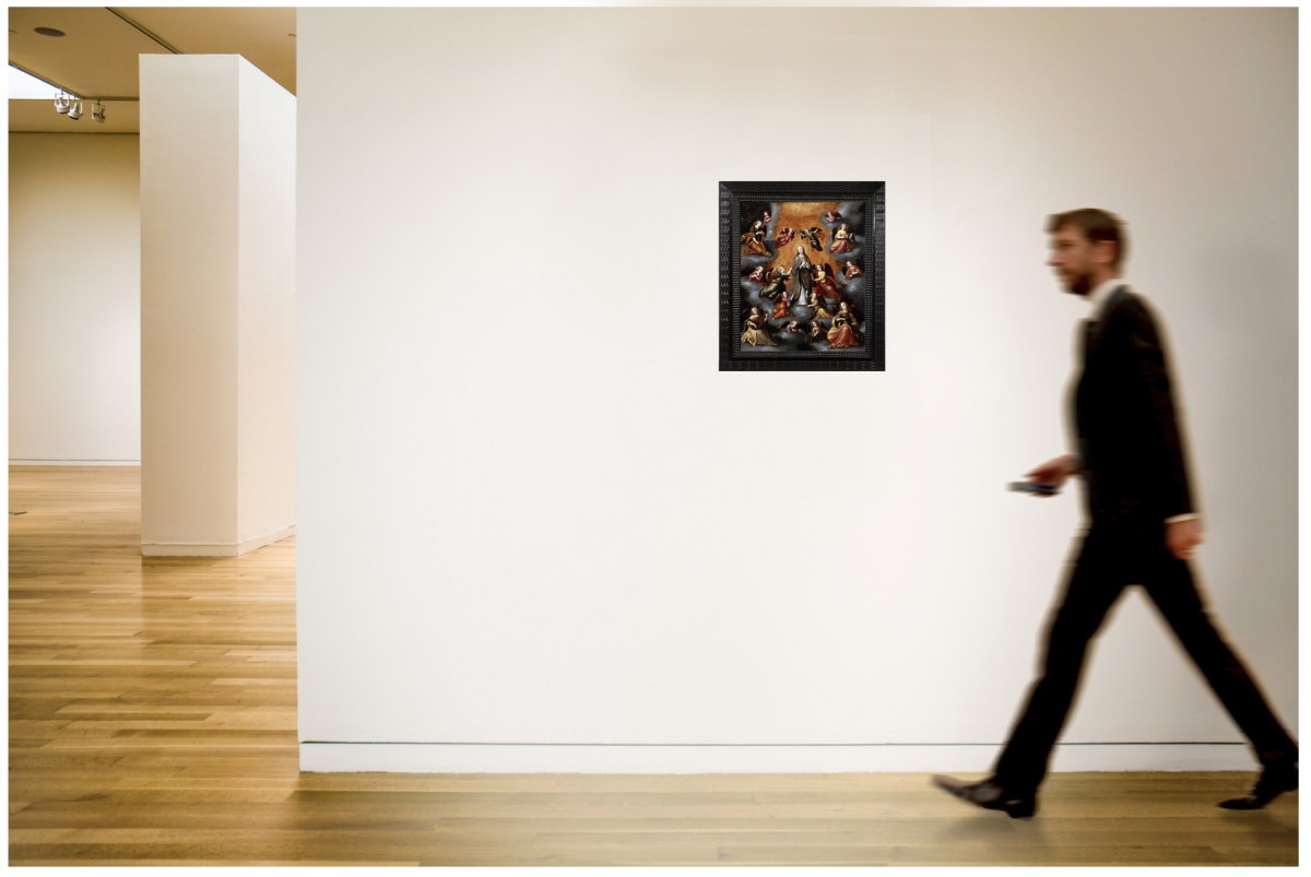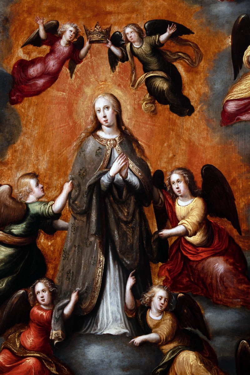 Iconographically, the painting belongs to the Flemish tradition of Marian Coronation imagery, a theme especially prized in post Tridentine Catholic contexts. It exemplifies the intersection between the lingering elegance of international Mannerism and the emerging baroque vocabulary, in which heightened theatricality and chromatic intensity play an increasingly central role.