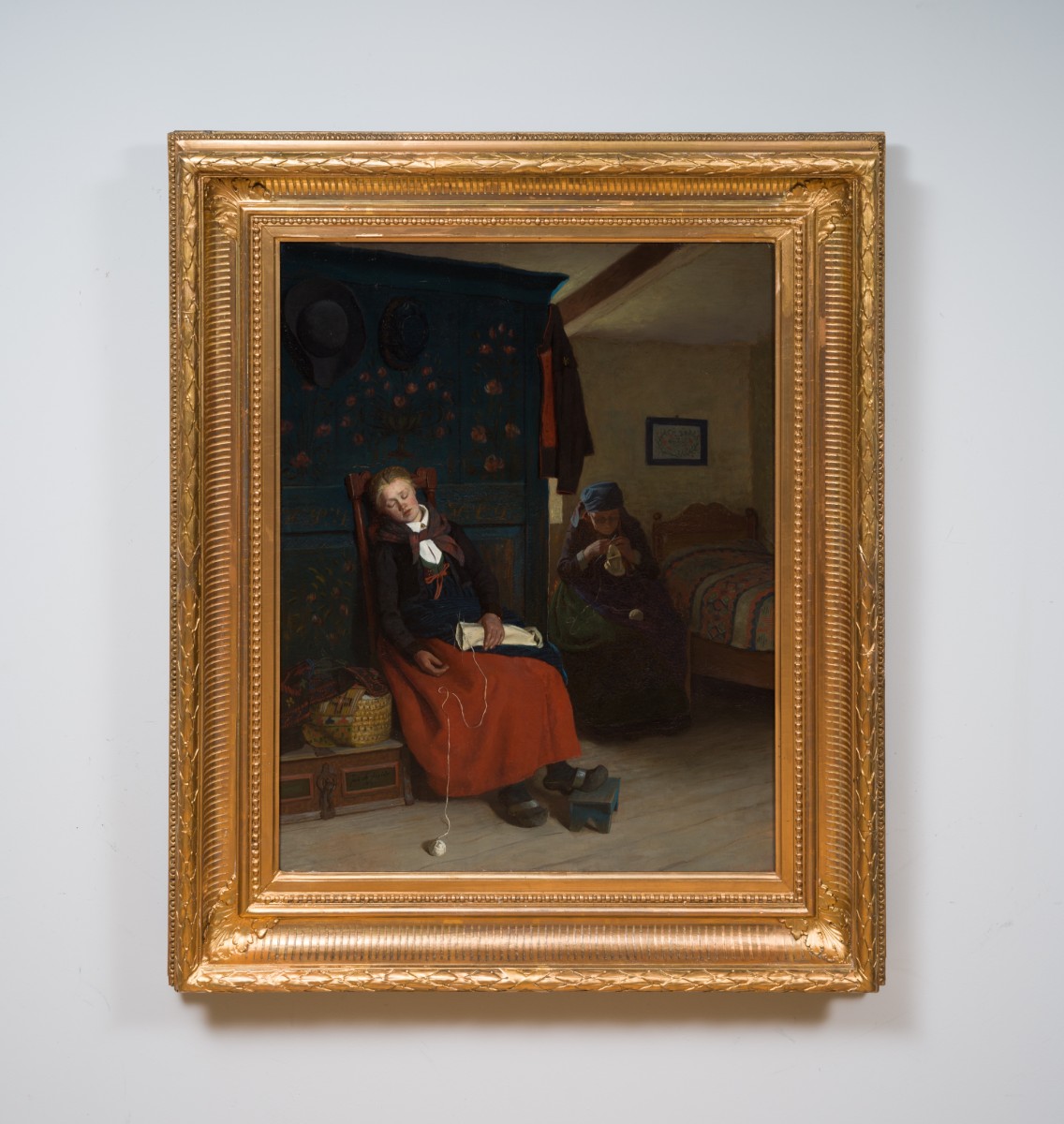 Painted in 1877, An Afternoon Nap belongs to the rich tradition of Swedish nineteenth century genre painting. Jakob Kulle presents an intimate domestic interior in which everyday life unfolds quietly and without theatricality. A young girl has fallen asleep in a chair while working with yarn, her head gently inclined to one side in a moment of complete rest. The stillness of the scene contrasts with the quiet activity of the older woman seated further back in the room, who continues her needlework.