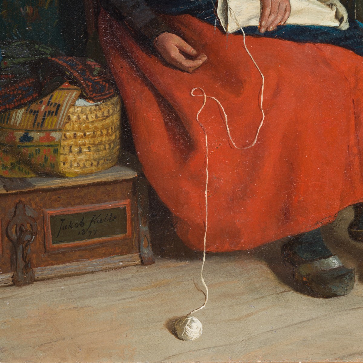 One of the most striking details in the painting is the ball of yarn that has rolled from the girl’s lap onto the floor. The thread runs loosely from her hands down across the skirt and onto the wooden floorboards where the small white ball rests. Kulle models this object with such care that it appears almost three dimensional. It anchors the foreground and enhances the illusion of depth within the room.