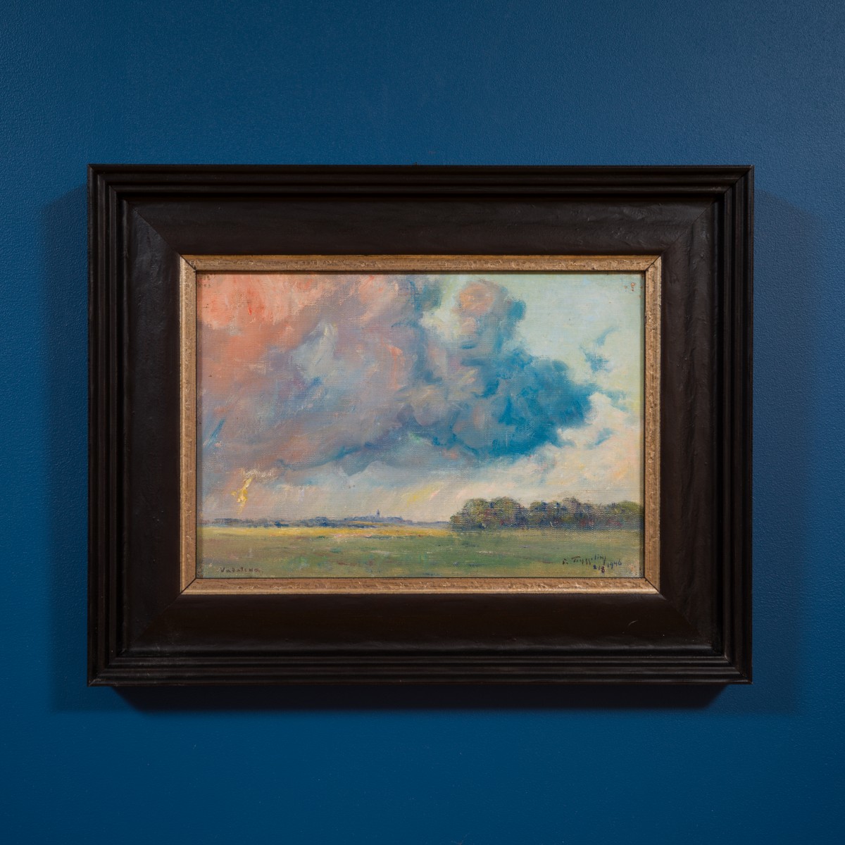 Vadstena, situated on the eastern shore of Lake Vättern, offered Tryggelin a setting of broad horizons and shifting weather. The open landscape around the town allows the sky to dominate the visual experience, and this painting transforms that expansive sky into the principal subject of the work. The result is a vivid atmospheric study that conveys both the calm of the countryside and the sudden drama of a summer storm.