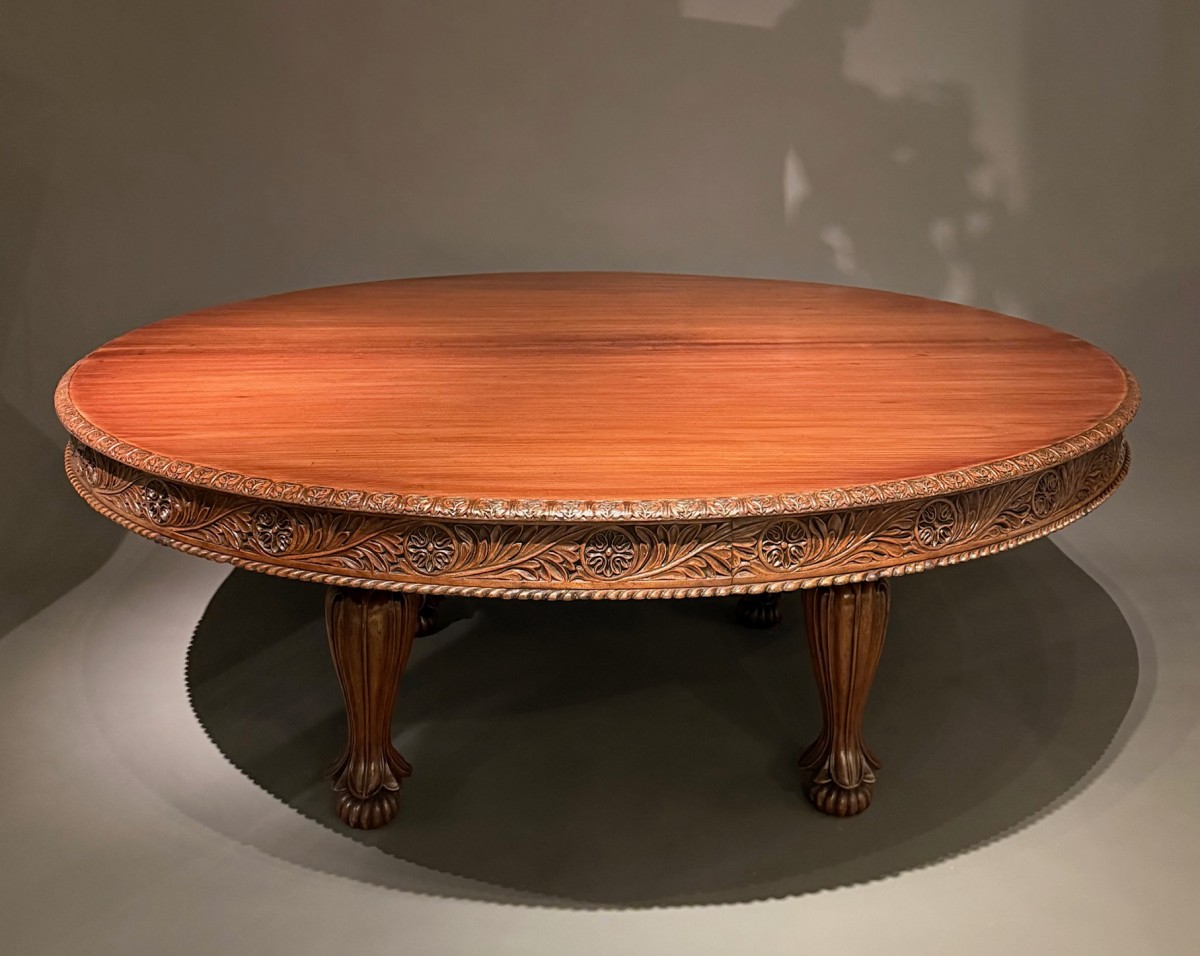A large Anglo-Indian mid 19th century Padouk circular centre or dining table for 12 persons.