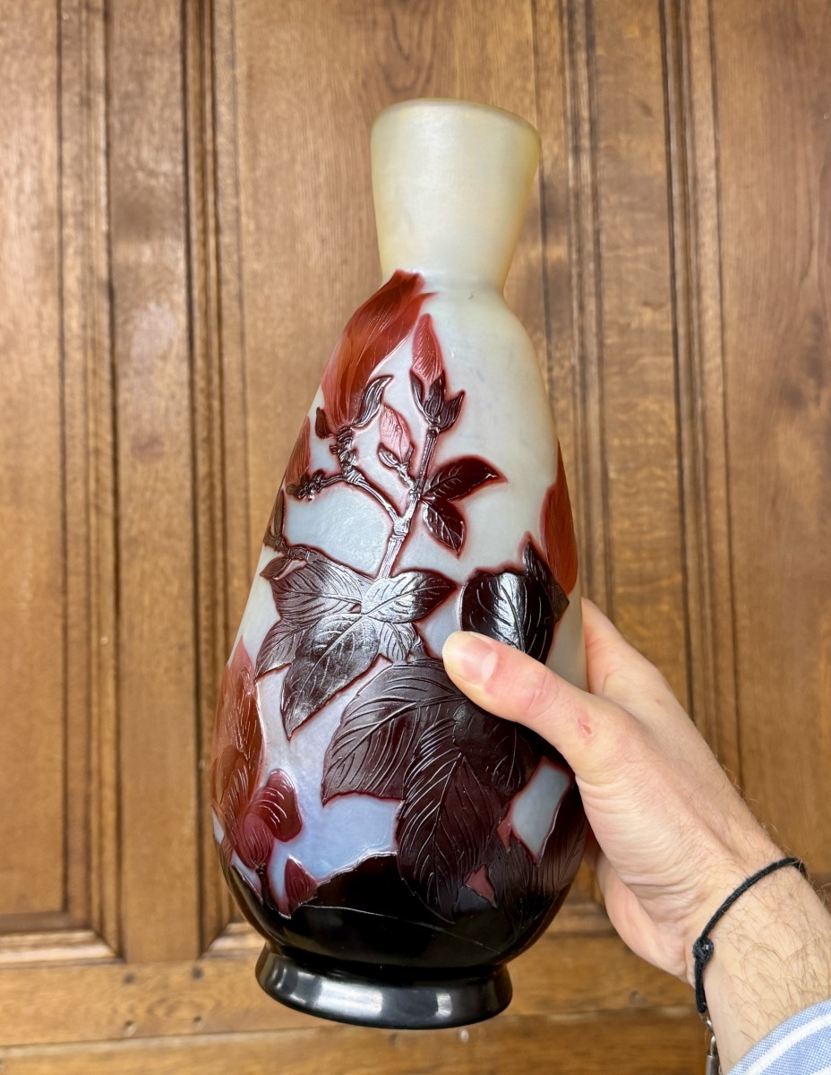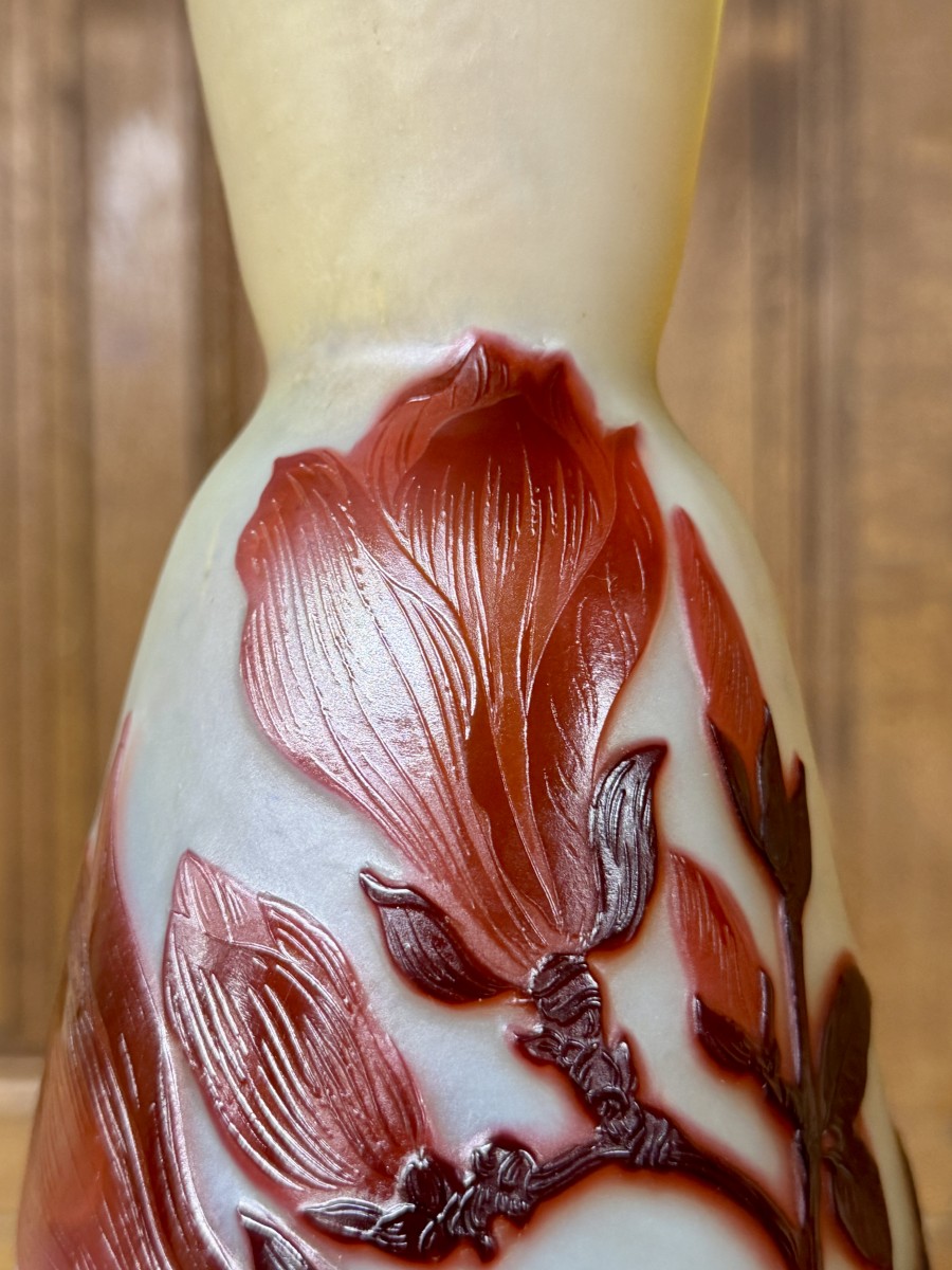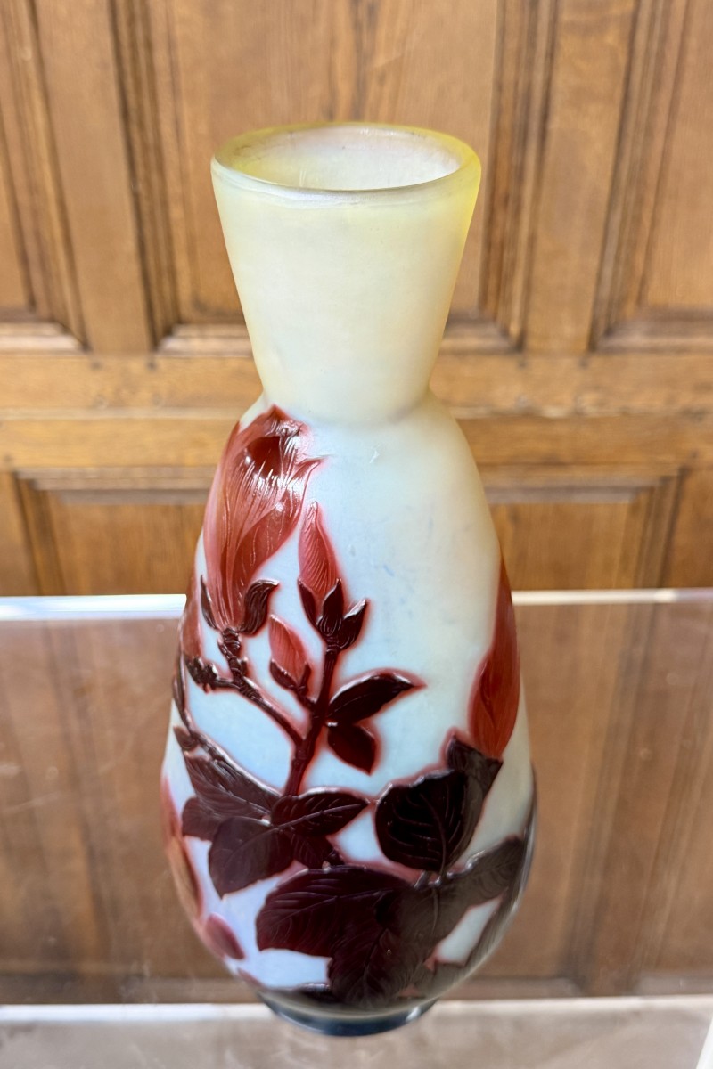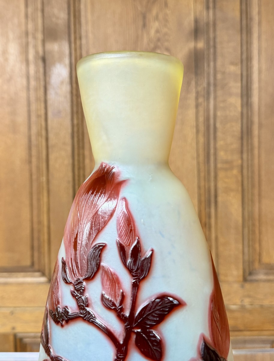A beautiful vase by Émile Gallé featuring a multi-layered, acid-etched design of magnolia flowers and leaves. Beautiful colors and high-quality decoration. Signed “Gallé” within the design. An Art Nouveau piece in perfect condition.