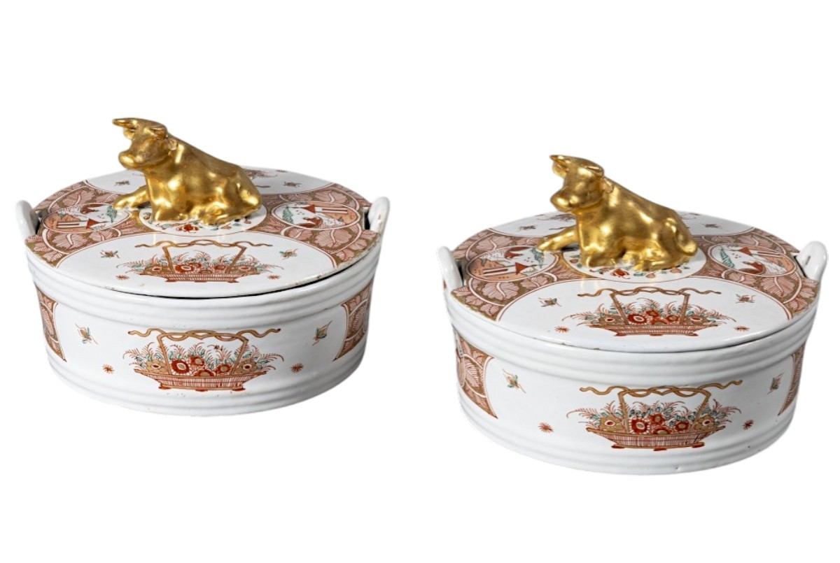 A pair of Dutch Delft doré round butter tubs with cover with a gilded lying cow. Beautiful decorated in red, green, yellow and gold on a white background. Chinoiserie decor of round and oval medallions, filled with Chinese landscape and flower basket. A similar example is in the collection of the Arnhem Museum.