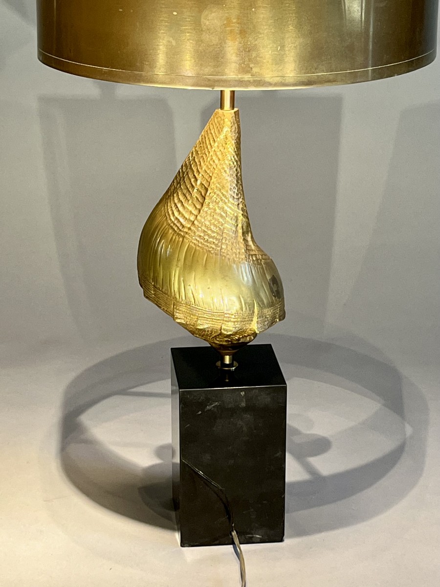 Shell lamp in bronze, brass and black marble.
