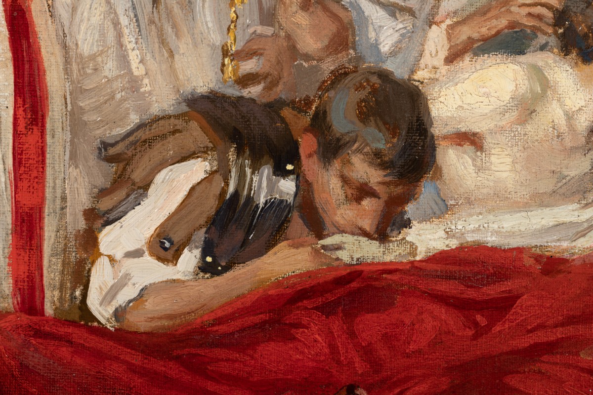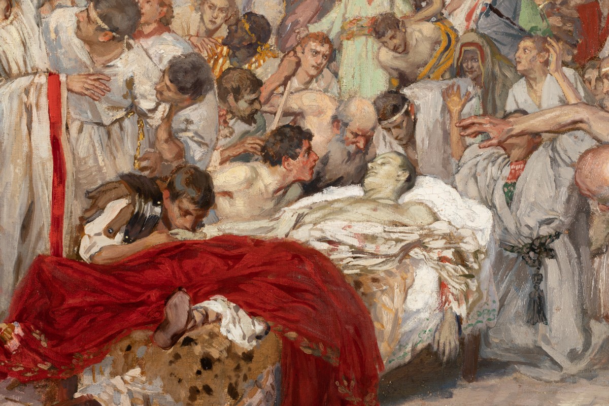 Caius Julius Caesar was assassinated on the 15th of March 44 B.C., day of the ides of March, in Pompey's Curia. This act was supposed to restore the Republic. Instead, it contributed to the establishment of the Empire. The scene shows the consul Mark Antony presenting the remains of his dead friend to a crowd that was aroused by his pathetic eloquence. It is thought that he is holding Caesar's will in his hand, which will not be revealed to the people until 20 March, five days later.